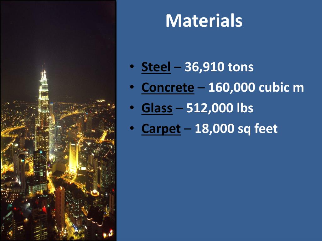 Materials • Steel – 36,910 tons • Concrete – 160,000 cubic m • Glass – 512,000 lbs • Carpet – 18,000 sq feet