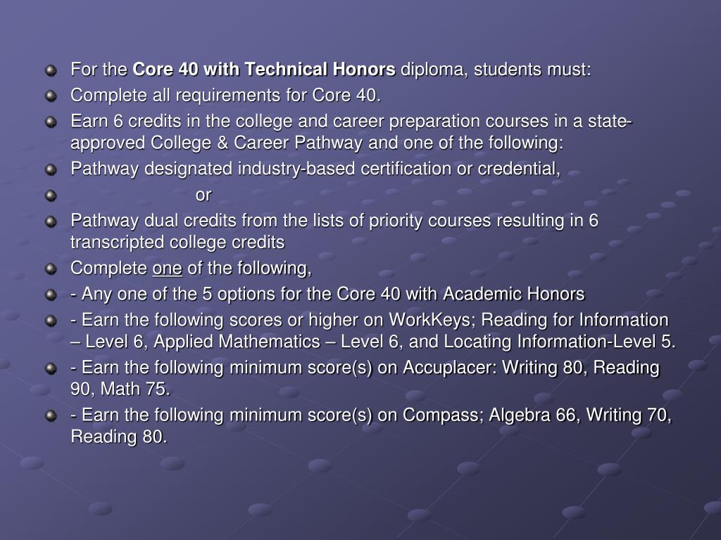 For the Core 40 with Technical Honors diploma, students must: Complete all requirements for Core 40. Earn 6 credits in the college and career preparation courses in a state-approved College & Career Pathway and one of the following: Pathway designated industry-based certification or credential, or Pathway dual credits from the lists of priority courses resulting in 6 transcripted college credits Complete one of the following, - Any one of the 5 options for the Core 40 with Academic Honors - Earn the following scores or higher on WorkKeys; Reading for Information – Level 6, Applied Mathematics – Level 6, and Locating Information-Level 5. - Earn the following minimum score(s) on Accuplacer: Writing 80, Reading 90, Math 75. - Earn the following minimum score(s) on Compass; Algebra 66, Writing 70, Reading 80.
