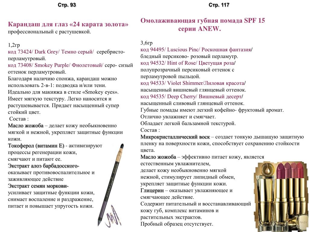 Стр. 93 Стр. 117 Карандаш для глаз «24 карата золота» профессиональный с растушевкой.1,2гркод 73424/ Dark Grey/ Темно серый/ серебристо- перламутровый.код 73408/ Smokey Purple/ Фиолетовый/ серо- сизый оттенок перламутровый.Благодаря наличию спонжа, карандаш можно использовать 2-в-1: подводка и/или тени.Идеально для макияжа в стиле «Smokey eyes».Имеет мягкую текстуру. Легко наносится и растушевывается. Придает насыщенный супер стойкий цвет. Состав :Масло жожоба – делает кожу необыкновенно мягкой и нежной, укрепляет защитные функции кожи. Токоферол (витамин Е) - активизируют процессы регенерации кожи, смягчают и питают ее. Экстракт алоэ барбадосского- оказывает противовоспалительное и заживляющее действие Экстракт семян моркови- усиливает защитные функции кожи, снимает воспаление и раздражение, питает и повышает упругость кожи. Омолаживающая губная помада SPF 15 серии ANEW. 3,6гр код 94495/ Luscious Pinc/ Роскошная фантазия/ бледный персиково- розовый перламутр. код 94532/ Hint of Rose/ Цветущая роза/ полупрозрачный персиковый оттенок с перламутровой пыльцой. код 94533/ Violet Shimmer/Лиловая красота/ насыщенный вишневый глянцевый оттенок. код 94535/ Deep Cherry/ Вишневый десерт/ насыщенный сливовый глянцевый оттенок. Губные помады имеют легкий кофейно- фруктовый аромат. Отлично увлажняет и смягчает. Обладает легкой бальзамной текстурой. Состав : Микрокристаллический воск – создает тонкую дышащую защитную пленку на поверхности кожи, способствует сохранению стойкости цвета. Масло жожоба – эффективно питает кожу, является естественным увлажнителем, делает кожу необыкновенно мягкой нежной, стимулирует липидный обмен, укрепляет защитные функции кожи. Глицерин – оказывает увлажняющее и смягчающее действие. Содержит питательный и восстанавливающий кожу губ, комплекс витаминов и растительных экстрактов. Пробный образец отсутствует.
