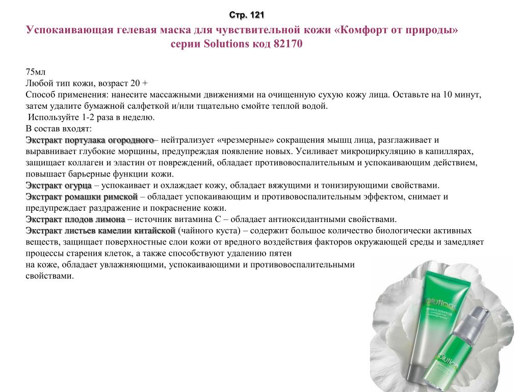 Стр. 121 Успокаивающая гелевая маска для чувствительной кожи «Комфорт от природы» серии Solutions код 8217075мл Любой тип кожи, возраст 20 +Способ применения: нанесите массажными движениями на очищенную сухую кожу лица. Оставьте на 10 минут, затем удалите бумажной салфеткой и/или тщательно смойте теплой водой. Используйте 1-2 раза в неделю.В состав входят:Экстракт портулака огородного– нейтрализует «чрезмерные» сокращения мышц лица, разглаживает и выравнивает глубокие морщины, предупреждая появление новых. Усиливает микроциркуляцию в капиллярах, защищает коллаген и эластин от повреждений, обладает противовоспалительным и успокаивающим действием, повышает барьерные функции кожи. Экстракт огурца – успокаивает и охлаждает кожу, обладает вяжущими и тонизирующими свойствами. Экстракт ромашки римской – обладает успокаивающим и противовоспалительным эффектом, снимает и предупреждает раздражение и покраснение кожи.Экстракт плодов лимона – источник витамина С – обладает антиоксидантными свойствами.Экстракт листьев камелии китайской (чайного куста) – содержит большое количество биологически активных веществ, защищает поверхностные слои кожи от вредного воздействия факторов окружающей среды и замедляет процессы старения клеток, а также способствуют удалению пятенна коже, обладает увлажняющими, успокаивающими и противовоспалительными свойствами.