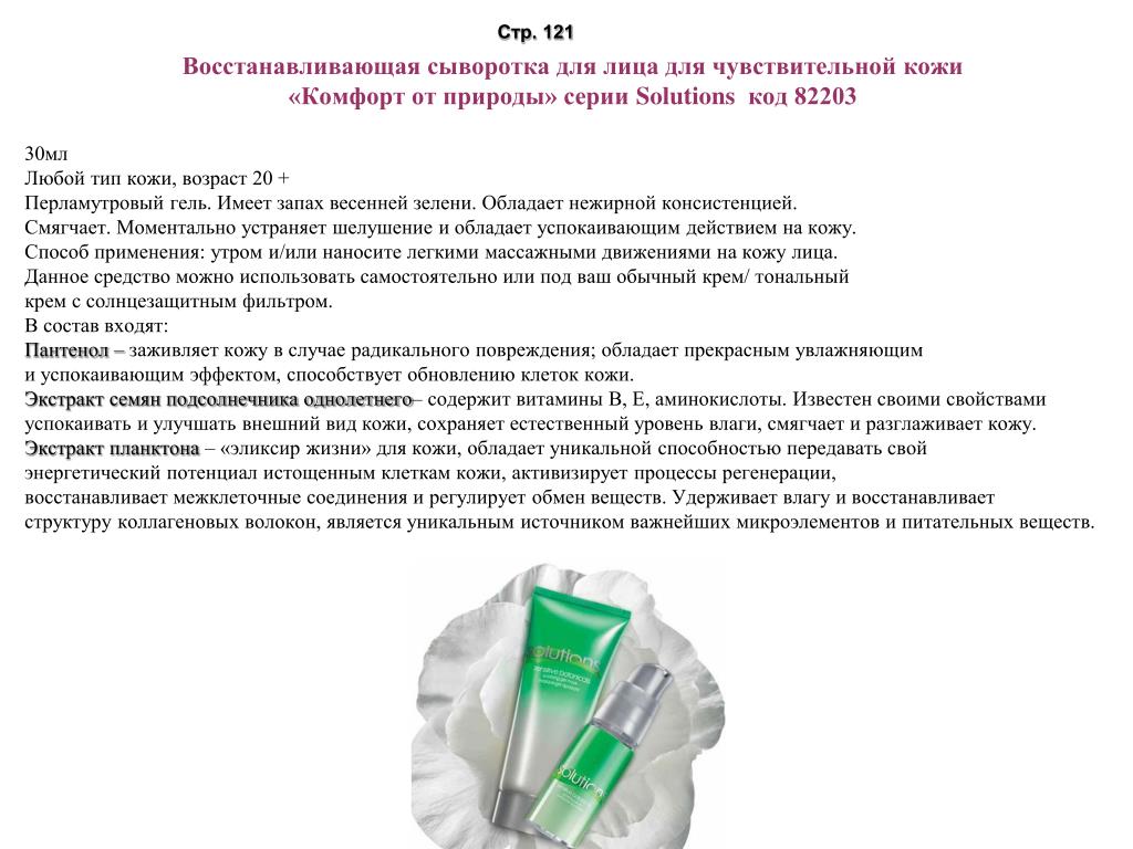Стр. 121 Восстанавливающая сыворотка для лица для чувствительной кожи «Комфорт от природы» серии Solutions код 82203 30мл Любой тип кожи, возраст 20 + Перламутровый гель. Имеет запах весенней зелени. Обладает нежирной консистенцией. Смягчает. Моментально устраняет шелушение и обладает успокаивающим действием на кожу. Способ применения: утром и/или наносите легкими массажными движениями на кожу лица. Данное средство можно использовать самостоятельно или под ваш обычный крем/ тональный крем с солнцезащитным фильтром. В состав входят: Пантенол – заживляет кожу в случае радикального повреждения; обладает прекрасным увлажняющим и успокаивающим эффектом, способствует обновлению клеток кожи. Экстракт семян подсолнечника однолетнего– содержит витамины В, Е, аминокислоты. Известен своими свойствами успокаивать и улучшать внешний вид кожи, сохраняет естественный уровень влаги, смягчает и разглаживает кожу. Экстракт планктона – «эликсир жизни» для кожи, обладает уникальной способностью передавать свой энергетический потенциал истощенным клеткам кожи, активизирует процессы регенерации, восстанавливает межклеточные соединения и регулирует обмен веществ. Удерживает влагу и восстанавливает структуру коллагеновых волокон, является уникальным источником важнейших микроэлементов и питательных веществ.