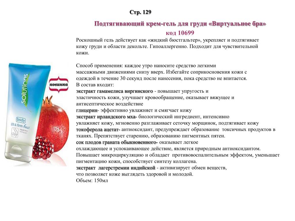 Стр. 129 Подтягивающий крем-гель для груди «Виртуальное бра» код 10699 Роскошный гель действует как «жидкий бюстгальтер», укрепляет и подтягивает кожу груди и области декольте. Гипоаллергенно. Подходит для чувствительной кожи. Способ применения: каждое утро наносите средство легкими массажными движениями снизу вверх. Избегайте соприкосновения кожи с одеждой в течение 30 секунд после нанесения, пока средство не впитается. В состав входит: экстракт гамамелиса виргинского - повышает упругость и эластичность кожи, улучшает кровообращение, оказывает вяжущее и антисептическое воздействие глицерин- эффективно увлажняет и смягчает кожу экстракт ирландского мха- биологический ингредиент, интенсивно увлажняет кожу, мгновенно разглаживает сеточку морщинок, подтягивает кожу токоферола ацетат- антиоксидант, предупреждает образование токсичных продуктов в тканях. Препятствует старению, образованию пигментных пятен. сок плодов граната обыкновенного- оказывает легкое охлаждающее и успокаивающее действие, является природным антиоксидантом. Повышает микроциркуляцию и обладает противовоспалительным эффектом, уменьшает пигментацию кожи, способствует синтезу коллагена. экстракт лагерстремии индийской - активизирует обмен веществ, что позволяет коже выглядеть здоровой и молодой. Объем: 150мл
