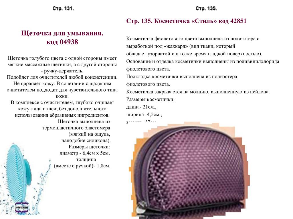 Стр. 131. Стр. 135. Щеточка для умывания. код 04938Щеточка голубого цвета с одной стороны имеет мягкие массажные щетинки, а с другой стороны - ручку-держатель. Подойдет для очистителей любой консистенции.Не царапает кожу. В сочетании с щадящим очистителем подходит для чувствительного типа кожи. В комплексе с очистителем, глубоко очищает кожу лица и шеи, без дополнительного использования абразивных ингредиентов. Щеточка выполнена из термопластичного эластомера (мягкий на ощупь, наподобие силикона). Размеры щеточки: диаметр - 6,4см x 5см, толщина (вместе с ручкой)- 1,8см. Стр. 135. Косметичка «Стиль» код 42851 Косметичка фиолетового цвета выполнена из полиэстера с выработкой под «жаккард» (вид ткани, который обладает узорчатой и в то же время гладкой поверхностью). Основание и отделка косметички выполнены из поливинилхлорида фиолетового цвета. Подкладка косметички выполнена из полиэстера фиолетового цвета. Косметичка закрывается на молнию, выполненную из нейлона. Размеры косметички: длина- 21см., ширина- 4,5см., высота- 12см.