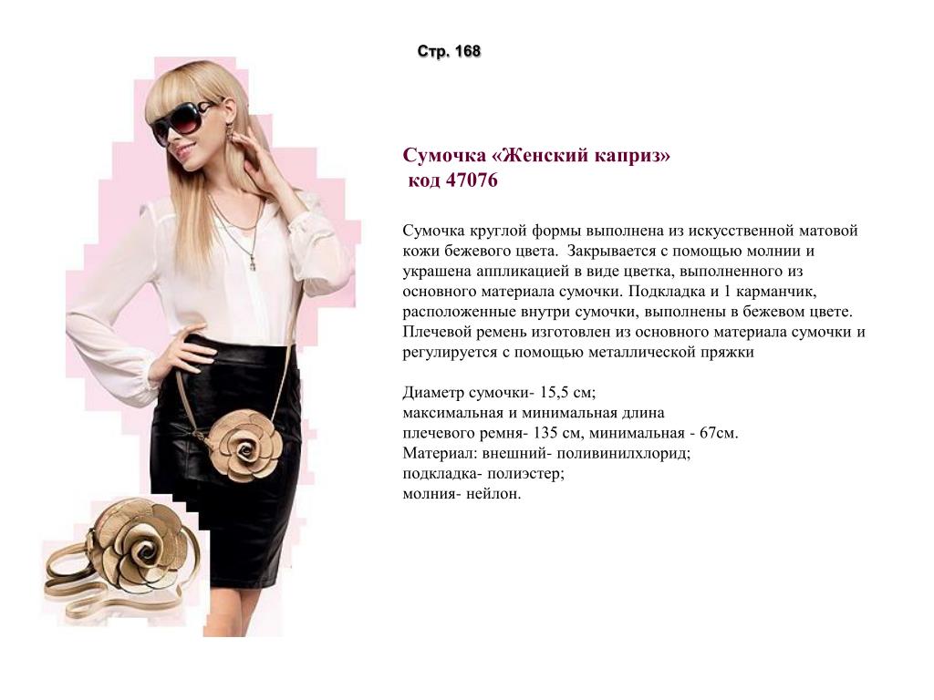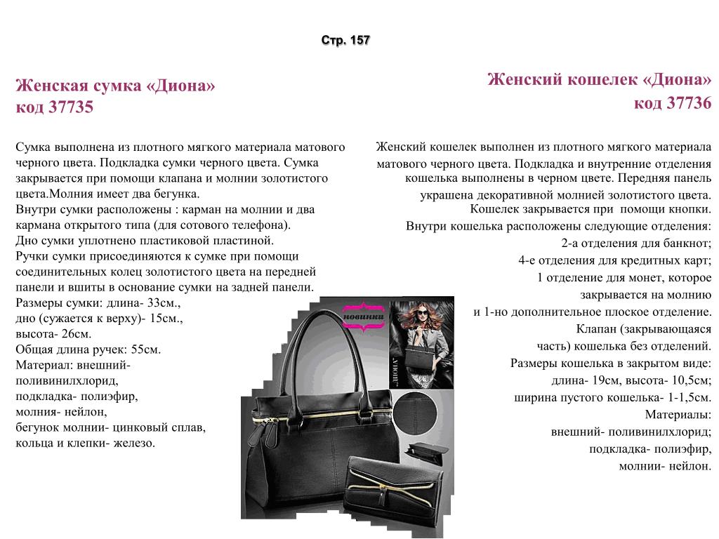 Стр. 157 Женская сумка «Диона» код 37735Сумка выполнена из плотного мягкого материала матового черного цвета. Подкладка сумки черного цвета. Сумка закрывается при помощи клапана и молнии золотистого цвета.Молния имеет два бегунка. Внутри сумки расположены : карман на молнии и два кармана открытого типа (для сотового телефона). Дно сумки уплотнено пластиковой пластиной.Ручки сумки присоединяются к сумке при помощи соединительных колец золотистого цвета на передней панели и вшиты в основание сумки на задней панели. Размеры сумки: длина- 33см., дно (сужается к верху)- 15см., высота- 26см. Общая длина ручек: 55см.Материал: внешний- поливинилхлорид, подкладка- полиэфир, молния- нейлон, бегунок молнии- цинковый сплав, кольца и клепки- железо. Женский кошелек «Диона» код 37736 Женский кошелек выполнен из плотного мягкого материала матового черного цвета. Подкладка и внутренние отделения кошелька выполнены в черном цвете. Передняя панель украшена декоративной молнией золотистого цвета. Кошелек закрывается при помощи кнопки. Внутри кошелька расположены следующие отделения: 2-а отделения для банкнот; 4-е отделения для кредитных карт; 1 отделение для монет, которое закрывается на молнию и 1-но дополнительное плоское отделение. Клапан (закрывающаяся часть) кошелька без отделений. Размеры кошелька в закрытом виде: длина- 19см, высота- 10,5см; ширина пустого кошелька- 1-1,5см. Материалы: внешний- поливинилхлорид; подкладка- полиэфир, молнии- нейлон.
