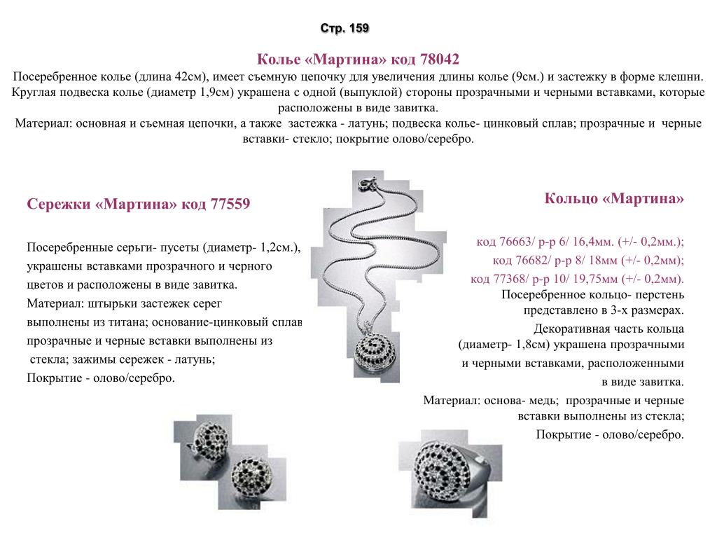Сережки «Мартина» код 77559 Посеребренные серьги- пусеты (диаметр- 1,2см.), украшены вставками прозрачного и черного цветов и расположены в виде завитка. Материал: штырьки застежек серег выполнены из титана; основание-цинковый сплав; прозрачные и черные вставки выполнены из стекла; зажимы сережек - латунь; Покрытие - олово/серебро. Кольцо «Мартина» код 76663/ р-р 6/ 16,4мм. (+/- 0,2мм.); код 76682/ р-р 8/ 18мм (+/- 0,2мм); код 77368/ р-р 10/ 19,75мм (+/- 0,2мм). Посеребренное кольцо- перстень представлено в 3-х размерах. Декоративная часть кольца (диаметр- 1,8см) украшена прозрачными и черными вставками, расположенными в виде завитка. Материал: основа- медь; прозрачные и черные вставки выполнены из стекла; Покрытие - олово/серебро. Стр. 159 Колье «Мартина» код 78042Посеребренное колье (длина 42см), имеет съемную цепочку для увеличения длины колье (9см.) и застежку в форме клешни. Круглая подвеска колье (диаметр 1,9см) украшена с одной (выпуклой) стороны прозрачными и черными вставками, которые расположены в виде завитка. Материал: основная исъемная цепочки, а также застежка - латунь; подвеска колье- цинковый сплав; прозрачные и черные вставки- стекло; покрытие олово/серебро.