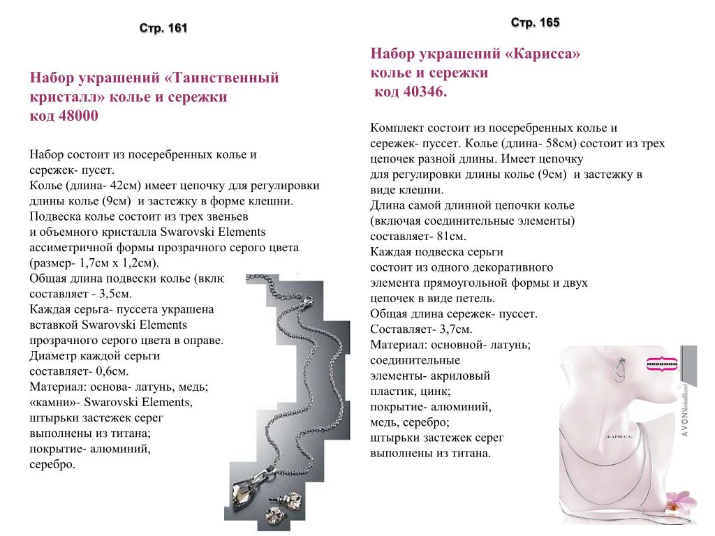 Стр. 165 Стр. 161 Набор украшений «Таинственный кристалл» колье и сережки код 48000Набор состоит из посеребренных колье и сережек- пусет. Колье (длина- 42см) имеет цепочку для регулировки длины колье (9см) и застежку в форме клешни. Подвеска колье состоит из трех звеньев и объемного кристалла Swarovski Elements ассиметричной формы прозрачного серого цвета (размер- 1,7см х 1,2см). Общая длина подвески колье (включая петельку) составляет - 3,5см. Каждая серьга- пуссета украшена вставкой Swarovski Elements прозрачного серого цвета в оправе. Диаметр каждой серьги составляет- 0,6см. Материал: основа- латунь, медь; «камни»- Swarovski Elements,штырьки застежек серег выполнены из титана; покрытие- алюминий, серебро. Набор украшений «Карисса» колье и сережки код 40346. Комплект состоит из посеребренных колье и сережек- пуссет. Колье (длина- 58см) состоит из трех цепочек разной длины. Имеет цепочку для регулировки длины колье (9см) и застежку в виде клешни. Длина самой длинной цепочки колье (включая соединительные элементы) составляет- 81см. Каждая подвеска серьги состоит из одного декоративного элемента прямоугольной формы и двух цепочек в виде петель. Общая длина сережек- пуссет. Составляет- 3,7см. Материал: основной- латунь; соединительные элементы- акриловый пластик, цинк; покрытие- алюминий, медь, серебро; штырьки застежек серег выполнены из титана.