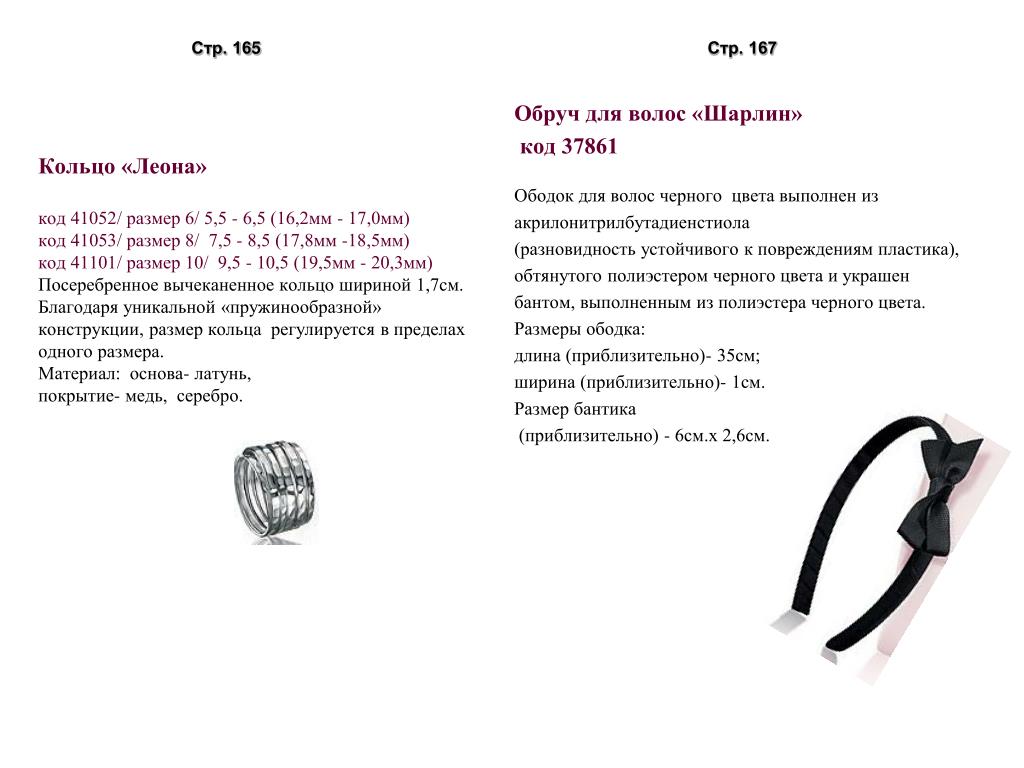 Кольцо «Леона»код 41052/ размер 6/ 5,5 - 6,5 (16,2мм - 17,0мм)код 41053/ размер 8/ 7,5 - 8,5 (17,8мм -18,5мм) код 41101/ размер 10/ 9,5 - 10,5 (19,5мм - 20,3мм)Посеребренное вычеканенное кольцо шириной 1,7см. Благодаря уникальной «пружинообразной» конструкции, размер кольца регулируется в пределах одного размера.Материал: основа- латунь, покрытие- медь, серебро. Стр. 165 Стр. 167 Обруч для волос «Шарлин» код 37861 Ободок для волос черного цвета выполнен из акрилонитрилбутадиенстиола (разновидность устойчивого к повреждениям пластика), обтянутого полиэстером черного цвета и украшен бантом, выполненным из полиэстера черного цвета. Размеры ободка: длина (приблизительно)- 35см; ширина (приблизительно)- 1см. Размер бантика (приблизительно) - 6см.х 2,6см.
