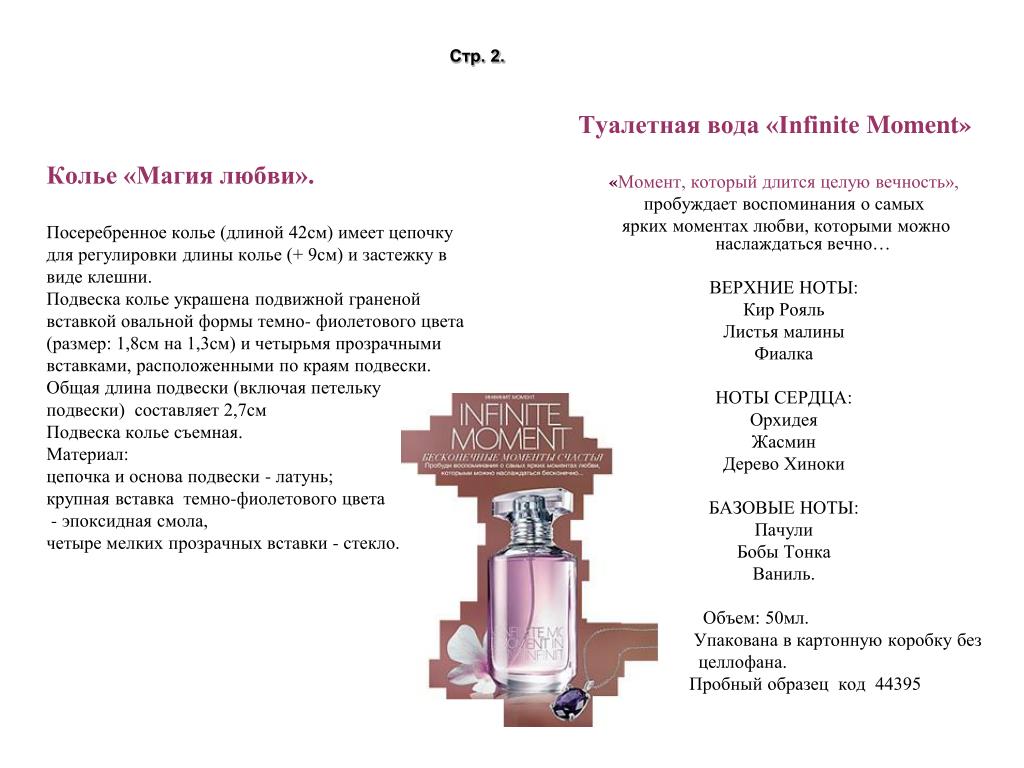 Колье «Магия любви». Посеребренное колье (длиной 42см) имеет цепочку для регулировки длины колье (+ 9см) и застежку в виде клешни. Подвеска колье украшена подвижной граненой вставкой овальной формы темно- фиолетового цвета (размер: 1,8см на 1,3см) и четырьмя прозрачными вставками, расположенными по краям подвески. Общая длина подвески (включая петельку подвески) составляет 2,7см Подвеска колье съемная.Материал: цепочка и основа подвески - латунь; крупная вставка темно-фиолетового цвета - эпоксидная смола, четыре мелких прозрачных вставки - стекло. Стр. 2. Туалетная вода «InfiniteMoment» «Момент, который длится целую вечность», пробуждает воспоминания о самых ярких моментах любви, которыми можно наслаждаться вечно… ВЕРХНИЕ НОТЫ: Кир Рояль Листья малины Фиалка НОТЫ СЕРДЦА: Орхидея Жасмин Дерево Хиноки БАЗОВЫЕ НОТЫ: Пачули Бобы Тонка Ваниль. Объем: 50мл. Упакована в картонную коробку без целлофана. Пробный образец код 44395