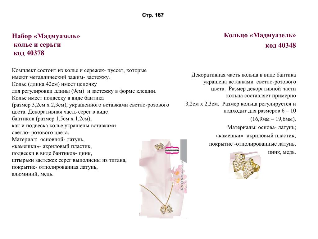 Набор «Мадмуазель» колье и серьги код 40378Комплект состоит из колье и сережек- пуссет, которыеимеют металлическийзажим- застежку. Колье (длина 42см) имеет цепочкудля регулировки длины (9см) и застежку в форме клешни. Колье имеет подвеску в виде бантика (размер 3,2см х 2,3см), украшенного вставками светло-розового цвета. Декоративная часть серег в видебантиков (размер 1,5см х 1,2см), как и подвеска колье,украшены вставками светло- розового цвета. Материал: основной- латунь,«камешки»- акриловый пластик,подвески в виде бантиков- цинк,штырьки застежек серег выполнены из титана, покрытие- отполированная латунь, алюминий, медь. Стр. 167 Кольцо «Мадмуазель» код 40348 Декоративная часть кольца в виде бантика украшена вставками светло-розового цвета. Размер декоративной части кольца составляет примерно 3,2см х 2,3см. Размер кольца регулируется и подходит для размеров 6 – 10 (16,9мм – 19,6мм). Материалы: основа- латунь; «камешки»- акриловый пластик; покрытие -отполированные латунь, цинк, медь.