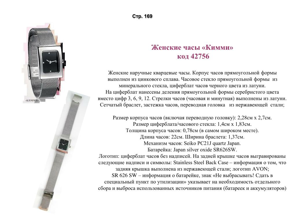 Женские часы «Кимми» код 42756Женские наручные кварцевые часы. Корпус часов прямоугольной формы выполнен из цинкового сплава. Часовое стекло прямоугольной формы из минерального стекла, циферблат часов черного цвета из латуни. На циферблат нанесены деления прямоугольной формы серебристого цвета вместо цифр 3, 6, 9, 12. Стрелки часов (часовая и минутная) выполнены из латуни. Сетчатый браслет, застежка часов, переводная головка из нержавеющей стали; Размер корпуса часов (включая переводную головку): 2,28см х 2,7см. Размер циферблата/часового стекла: 1,4см х 1,83см. Толщина корпуса часов: 0,78см (в самом широком месте). Длина часов: 22cм. Ширина браслета: 1,37см. Механизм часов: Seiko PC21J quartz Japan. Батарейка: Japan silver oxide SR626SW. Логотип: циферблат часов без надписей. На задней крышке часов выгравированы следующие надписи и символы: Stainless Steel Back Case – информация о том, что задняя крышка выполнена из нержавеющей стали; логотип AVON;SR 626 SW – информация о батарейке, знак «Не выбрасывать! Сдать в специальный пункт по утилизации» указывает на необходимость отдельного сбора и выброса использованных источников питания (батареек и аккумуляторов) Стр. 169