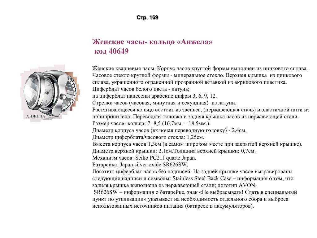 Женские часы- кольцо «Анжела» код 40649Женские кварцевые часы. Корпус часов круглой формы выполнен из цинкового сплава. Часовое стекло круглой формы - минеральное стекло. Верхняя крышка из цинкового сплава, украшенного ограненной прозрачной вставкой из акрилового пластика. Циферблат часов белого цвета - латунь; на циферблат нанесены арабские цифры 3, 6, 9, 12. Стрелки часов (часовая, минутная и секундная) из латуни. Растягивающееся кольцо состоит из звеньев, (нержавеющая сталь) и эластичной нити из полипропилена. Переводная головка и задняя крышка часов из нержавеющей стали. Размер часов- кольца: 7- 8,5 (16,7мм. – 18.5мм.).Диаметр корпуса часов (включая переводную головку) - 2,4см. Диаметр циферблата/часового стекла: 1,25см. Высота корпуса часов:1,3см (в самом широком месте при закрытой верхней крышке). Диаметр верхней крышки: 2,1см.Толщина верхней крышки: 0,7см. Механизм часов: Seiko PC21J quartz Japan. Батарейка: Japan silver oxide SR626SW. Логотип: циферблат часов без надписей. На задней крышке часов выгравированы следующие надписи и символы: Stainless Steel Back Case – информация о том, что задняя крышка выполнена из нержавеющей стали; логотип AVON; SR626SW – информация о батарейке, знак «Не выбрасывать! Сдать в специальный пункт по утилизации» указывает на необходимость отдельного сбора и выброса использованных источников питания (батареек и аккумуляторов). Стр. 169