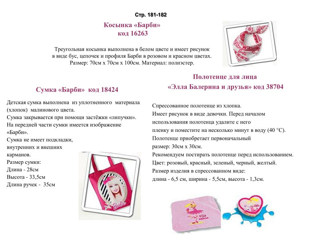 Сумка «Барби» код 18424 Детская сумка выполнена из уплотненного материала (хлопок) малинового цвета. Сумка закрывается при помощи застёжки «липучки». На передней части сумки имеется изображение «Барби». Сумка не имеет подкладки, внутренних и внешних карманов. Размер сумки: Длина - 28см Высота - 33,5см Длина ручек - 35см Полотенце для лица «Элла Балерина и друзья» код 38704 Спрессованное полотенце из хлопка. Имеет рисунок в виде девочки. Перед началом использования полотенца удалите с него пленку и поместите на несколько минут в воду (40 °С). Полотенце приобретает первоначальный размер: 30см х 30см. Рекомендуем постирать полотенце перед использованием. Цвет: розовый, красный, зеленый, черный, желтый. Размер изделия в спрессованном виде: длина - 6,5 см, ширина - 5,5см, высота - 1,3см. Косынка «Барби» код 16263Треугольная косынка выполнена в белом цвете и имеет рисунок в виде бус, цепочек и профиля Барби в розовом и красном цветах. Размер: 70см х 70см х 100см. Материал: полиэстер. Стр. 181-182