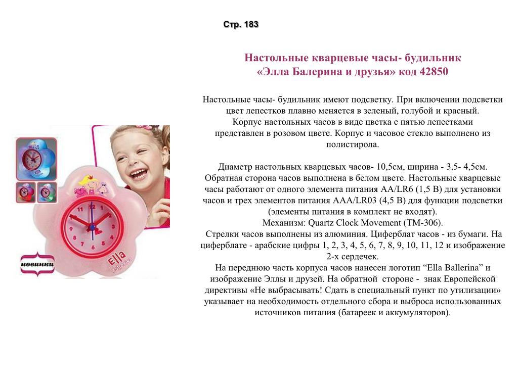 Настольные кварцевые часы- будильник «Элла Балерина и друзья» код 42850Настольные часы- будильник имеют подсветку. При включении подсветки цвет лепестков плавно меняется в зеленый, голубой и красный.Корпус настольных часов в виде цветка с пятью лепестками представлен в розовом цвете. Корпус и часовое стекло выполнено из полистирола. Диаметр настольных кварцевых часов- 10,5см, ширина - 3,5- 4,5см. Обратная сторона часов выполнена в белом цвете. Настольные кварцевые часы работают от одного элемента питания АА/LR6 (1,5 В) для установки часов и трех элементов питания ААА/LR03 (4,5 В) для функции подсветки (элементы питания в комплект не входят). Механизм: Quartz Clock Movement (ТМ-306). Стрелки часов выполнены из алюминия. Циферблат часов - из бумаги. На циферблате - арабские цифры 1, 2, 3, 4, 5, 6, 7, 8, 9, 10, 11, 12 и изображение 2-х сердечек. На переднюю часть корпуса часов нанесен логотип “Ella Ballerina” и изображение Эллы и друзей. На обратной стороне - знак Европейской директивы «Не выбрасывать! Сдать в специальный пункт по утилизации» указывает на необходимость отдельного сбора и выброса использованных источников питания (батареек и аккумуляторов). Стр. 183
