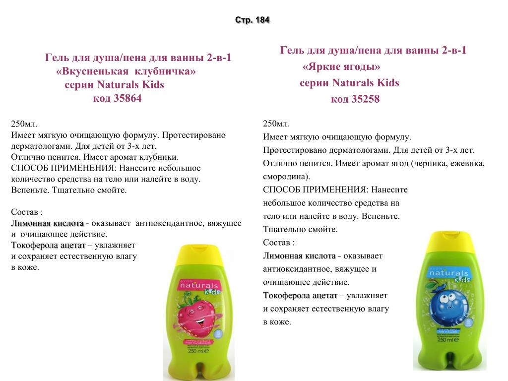 Стр. 184 Гель для душа/пена для ванны 2-в-1 «Вкусненькая клубничка» серии Naturals Kids код 35864 250мл.Имеет мягкую очищающую формулу. Протестировано дерматологами. Для детей от 3-х лет.Отлично пенится. Имеет аромат клубники.СПОСОБ ПРИМЕНЕНИЯ: Нанесите небольшое количество средства на тело или налейте в воду. Вспеньте. Тщательно смойте.Состав : Лимонная кислота - оказывает антиоксидантное, вяжущее и очищающее действие. Токоферола ацетат – увлажняет и сохраняет естественную влагу в коже. Гель для душа/пена для ванны 2-в-1 «Яркие ягоды» серии Naturals Kids код 35258 250мл. Имеет мягкую очищающую формулу. Протестировано дерматологами. Для детей от 3-х лет. Отлично пенится. Имеет аромат ягод (черника, ежевика, смородина). СПОСОБ ПРИМЕНЕНИЯ: Нанесите небольшое количество средства на тело или налейте в воду. Вспеньте. Тщательно смойте. Состав : Лимонная кислота - оказывает антиоксидантное, вяжущее и очищающее действие. Токоферола ацетат – увлажняет и сохраняет естественную влагу в коже.