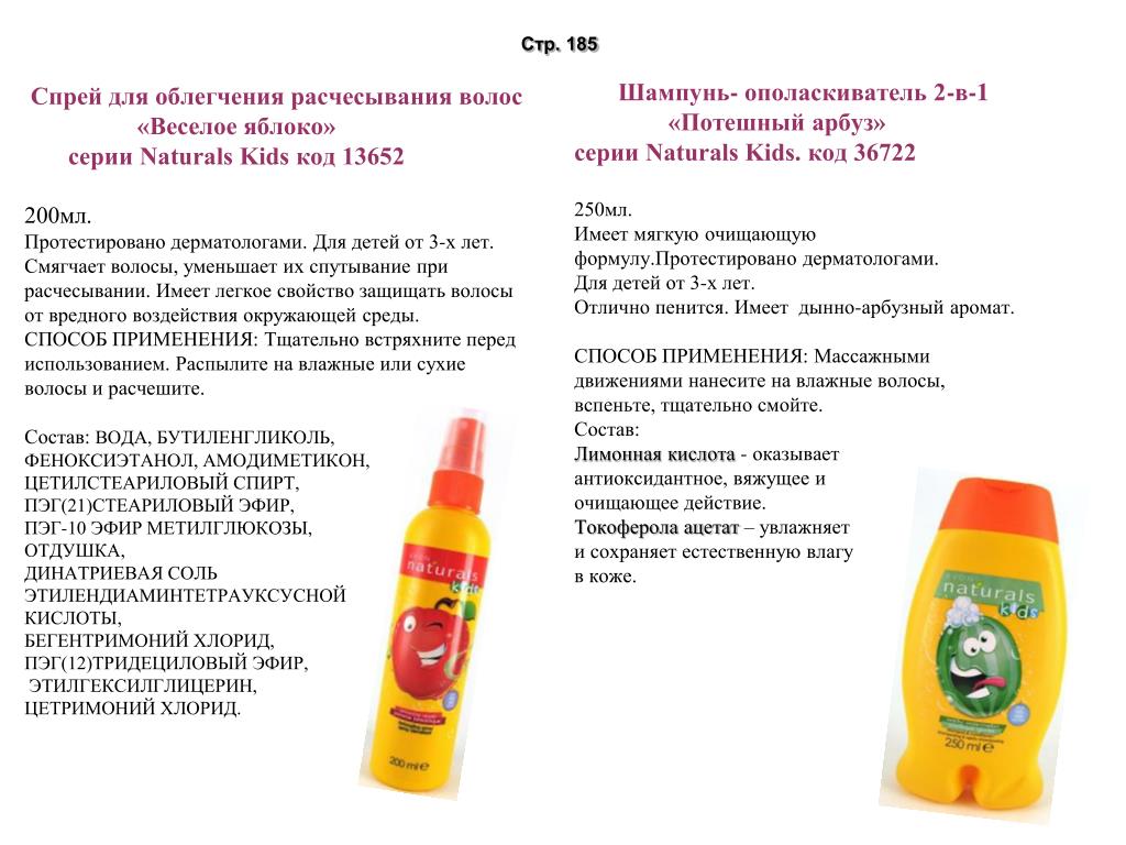 Стр. 185 Спрей для облегчения расчесывания волос «Веселое яблоко» серии Naturals Kids код 13652200мл.Протестировано дерматологами. Для детей от 3-х лет.Смягчает волосы, уменьшает их спутывание при расчесывании. Имеет легкое свойство защищать волосы от вредного воздействия окружающей среды. СПОСОБ ПРИМЕНЕНИЯ: Тщательно встряхните перед использованием. Распылите на влажные или сухие волосы и расчешите.Состав:ВОДА, БУТИЛЕНГЛИКОЛЬ, ФЕНОКСИЭТАНОЛ, АМОДИМЕТИКОН, ЦЕТИЛСТЕАРИЛОВЫЙ СПИРТ, ПЭГ(21)СТЕАРИЛОВЫЙ ЭФИР, ПЭГ-10 ЭФИР МЕТИЛГЛЮКОЗЫ, ОТДУШКА, ДИНАТРИЕВАЯ СОЛЬ ЭТИЛЕНДИАМИНТЕТРАУКСУСНОЙ КИСЛОТЫ, БЕГЕНТРИМОНИЙ ХЛОРИД, ПЭГ(12)ТРИДЕЦИЛОВЫЙ ЭФИР, ЭТИЛГЕКСИЛГЛИЦЕРИН, ЦЕТРИМОНИЙ ХЛОРИД. Шампунь- ополаскиватель 2-в-1 «Потешный арбуз» серии Naturals Kids. код 36722 250мл. Имеет мягкую очищающую формулу.Протестировано дерматологами. Для детей от 3-х лет. Отлично пенится. Имеет дынно-арбузный аромат. СПОСОБ ПРИМЕНЕНИЯ: Массажными движениями нанесите на влажные волосы, вспеньте, тщательно смойте. Состав: Лимонная кислота - оказывает антиоксидантное, вяжущее и очищающее действие. Токоферола ацетат – увлажняет и сохраняет естественную влагу в коже.
