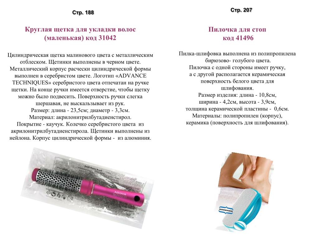 Стр. 207 Стр. 188 Круглая щетка для укладки волос (маленькая) код 31042Цилиндрическая щетка малинового цвета с металлическим отблеском. Щетинки выполнены в черном цвете. Металлический корпус расчески цилиндрической формы выполнен в серебристом цвете. Логотип «ADVANCE TECHNIQUES» серебристого цвета отпечатан на ручке щетки. На конце ручки имеется отверстие, чтобы щетку можно было подвесить. Поверхность ручки слегка шершавая, не выскальзывает из рук.Размер: длина - 23,5см; диаметр - 3,3см. Материал: акрилонитрилбутадиенстирол. Покрытие - каучук. Колечко серебристого цвета из акрилонитрилбутадиенстирола. Щетинки выполнены из нейлона. Корпус цилиндрической формы - из алюминия. Пилочка для стоп код 41496 Пилка-шлифовка выполнена из полипропилена бирюзово- голубого цвета. Пилочка с одной стороны имеет ручку, а с другой располагается керамическая поверхность белого цвета для шлифования. Размер изделия: длина - 10,8см, ширина - 4,2см, высота - 3,9см, толщина керамической пластины - 0,6см. Материалы: полипропилен (корпус), керамика (поверхность для шлифования).