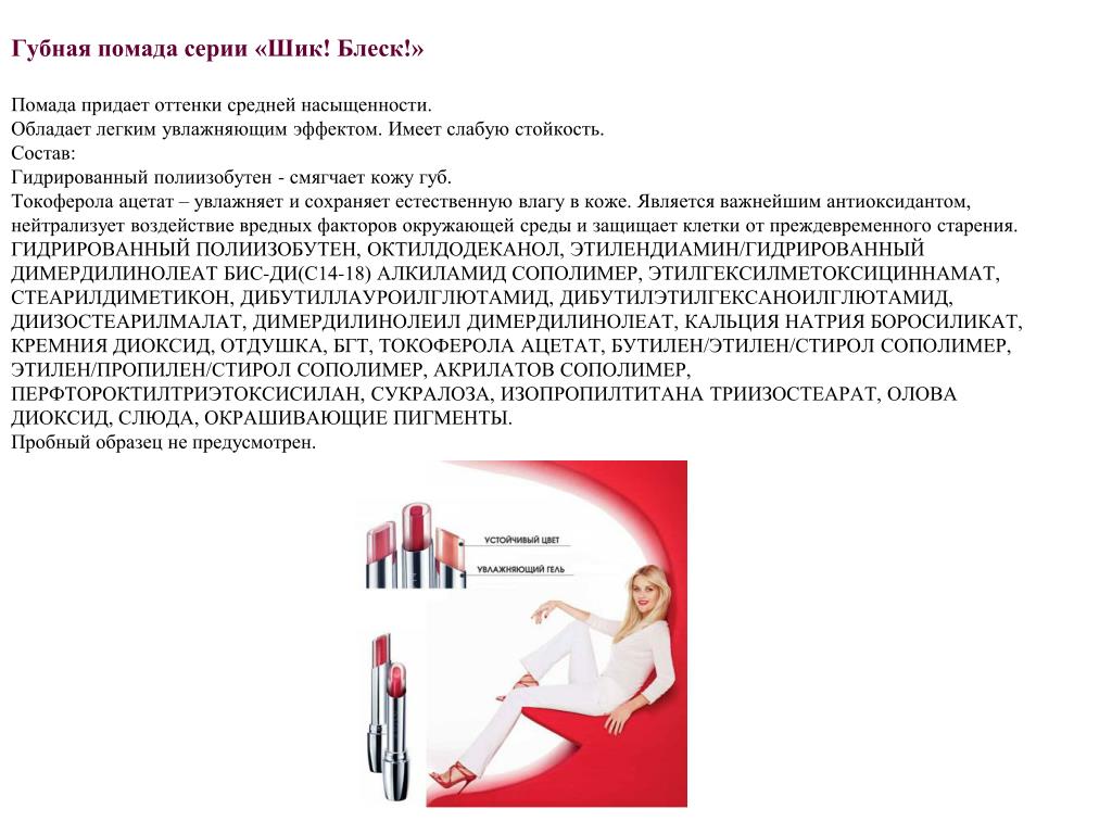 Губная помада серии «Шик! Блеск!»Помада придает оттенки средней насыщенности. Обладает легким увлажняющим эффектом. Имеет слабую стойкость.Состав: Гидрированный полиизобутен - смягчает кожу губ. Токоферола ацетат – увлажняет и сохраняет естественную влагу в коже. Является важнейшим антиоксидантом, нейтрализует воздействие вредных факторов окружающей среды и защищает клетки от преждевременного старения.ГИДРИРОВАННЫЙ ПОЛИИЗОБУТЕН, ОКТИЛДОДЕКАНОЛ, ЭТИЛЕНДИАМИН/ГИДРИРОВАННЫЙ ДИМЕРДИЛИНОЛЕАТ БИС-ДИ(С14-18) АЛКИЛАМИД СОПОЛИМЕР, ЭТИЛГЕКСИЛМЕТОКСИЦИННАМАТ, СТЕАРИЛДИМЕТИКОН, ДИБУТИЛЛАУРОИЛГЛЮТАМИД, ДИБУТИЛЭТИЛГЕКСАНОИЛГЛЮТАМИД, ДИИЗОСТЕАРИЛМАЛАТ, ДИМЕРДИЛИНОЛЕИЛ ДИМЕРДИЛИНОЛЕАТ, КАЛЬЦИЯ НАТРИЯ БОРОСИЛИКАТ, КРЕМНИЯ ДИОКСИД, ОТДУШКА, БГТ, ТОКОФЕРОЛА АЦЕТАТ, БУТИЛЕН/ЭТИЛЕН/СТИРОЛ СОПОЛИМЕР, ЭТИЛЕН/ПРОПИЛЕН/СТИРОЛ СОПОЛИМЕР, АКРИЛАТОВ СОПОЛИМЕР, ПЕРФТОРОКТИЛТРИЭТОКСИСИЛАН, СУКРАЛОЗА, ИЗОПРОПИЛТИТАНА ТРИИЗОСТЕАРАТ, ОЛОВА ДИОКСИД, СЛЮДА, ОКРАШИВАЮЩИЕ ПИГМЕНТЫ.Пробный образец не предусмотрен.