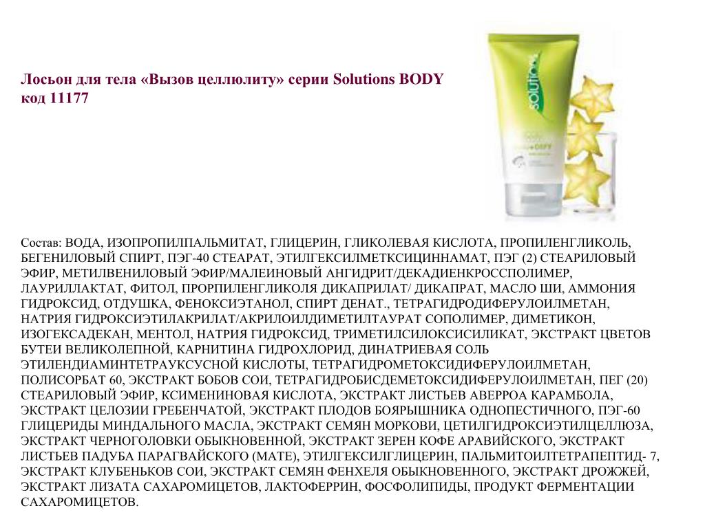 Лосьон для тела «Вызов целлюлиту» серии Solutions BODYкод 11177Состав: ВОДА, ИЗОПРОПИЛПАЛЬМИТАТ, ГЛИЦЕРИН, ГЛИКОЛЕВАЯ КИСЛОТА, ПРОПИЛЕНГЛИКОЛЬ, БЕГЕНИЛОВЫЙ СПИРТ, ПЭГ-40 СТЕАРАТ, ЭТИЛГЕКСИЛМЕТКСИЦИННАМАТ, ПЭГ (2) СТЕАРИЛОВЫЙ ЭФИР, МЕТИЛВЕНИЛОВЫЙ ЭФИР/МАЛЕИНОВЫЙ АНГИДРИТ/ДЕКАДИЕНКРОССПОЛИМЕР, ЛАУРИЛЛАКТАТ, ФИТОЛ, ПРОРПИЛЕНГЛИКОЛЯ ДИКАПРИЛАТ/ ДИКАПРАТ, МАСЛО ШИ, АММОНИЯ ГИДРОКСИД, ОТДУШКА, ФЕНОКСИЭТАНОЛ, СПИРТ ДЕНАТ., ТЕТРАГИДРОДИФЕРУЛОИЛМЕТАН, НАТРИЯ ГИДРОКСИЭТИЛАКРИЛАТ/АКРИЛОИЛДИМЕТИЛТАУРАТ СОПОЛИМЕР, ДИМЕТИКОН, ИЗОГЕКСАДЕКАН, МЕНТОЛ, НАТРИЯ ГИДРОКСИД, ТРИМЕТИЛСИЛОКСИСИЛИКАТ, ЭКСТРАКТ ЦВЕТОВ БУТЕИ ВЕЛИКОЛЕПНОЙ, КАРНИТИНА ГИДРОХЛОРИД, ДИНАТРИЕВАЯ СОЛЬ ЭТИЛЕНДИАМИНТЕТРАУКСУСНОЙ КИСЛОТЫ, ТЕТРАГИДРОМЕТОКСИДИФЕРУЛОИЛМЕТАН, ПОЛИСОРБАТ 60, ЭКСТРАКТ БОБОВ СОИ, ТЕТРАГИДРОБИСДЕМЕТОКСИДИФЕРУЛОИЛМЕТАН, ПЕГ (20) СТЕАРИЛОВЫЙ ЭФИР, КСИМЕНИНОВАЯ КИСЛОТА, ЭКСТРАКТ ЛИСТЬЕВ АВЕРРОА КАРАМБОЛА, ЭКСТРАКТ ЦЕЛОЗИИ ГРЕБЕНЧАТОЙ, ЭКСТРАКТ ПЛОДОВ БОЯРЫШНИКА ОДНОПЕСТИЧНОГО, ПЭГ-60 ГЛИЦЕРИДЫ МИНДАЛЬНОГО МАСЛА, ЭКСТРАКТ СЕМЯН МОРКОВИ, ЦЕТИЛГИДРОКСИЭТИЛЦЕЛЛЮЗА, ЭКСТРАКТ ЧЕРНОГОЛОВКИ ОБЫКНОВЕННОЙ, ЭКСТРАКТ ЗЕРЕН КОФЕ АРАВИЙСКОГО, ЭКСТРАКТ ЛИСТЬЕВ ПАДУБА ПАРАГВАЙСКОГО (МАТЕ), ЭТИЛГЕКСИЛГЛИЦЕРИН, ПАЛЬМИТОИЛТЕТРАПЕПТИД- 7, ЭКСТРАКТ КЛУБЕНЬКОВ СОИ, ЭКСТРАКТ СЕМЯН ФЕНХЕЛЯ ОБЫКНОВЕННОГО, ЭКСТРАКТ ДРОЖЖЕЙ, ЭКСТРАКТ ЛИЗАТА САХАРОМИЦЕТОВ, ЛАКТОФЕРРИН, ФОСФОЛИПИДЫ, ПРОДУКТ ФЕРМЕНТАЦИИ САХАРОМИЦЕТОВ.