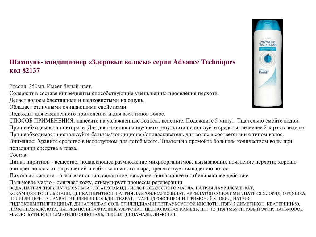 Шампунь- кондиционер «Здоровые волосы» серии Advance Techniquesкод 82137Россия, 250мл. Имеет белый цвет.Содержит в составе ингредиенты способствующие уменьшению проявления перхоти. Делает волосы блестящими и шелковистыми на ощупь. Обладает отличными очищающими свойствами. Подходит для ежедневного применения и для всех типов волос.СПОСОБ ПРИМЕНЕНИЯ: нанесите на увлажненные волосы, вспеньте. Подождите 5 минут. Тщательно смойте водой. При необходимости повторите. Для достижения наилучшего результата используйте средство не менее 2-х раз в неделю. При необходимости используйте бальзам/кондиционер/ополаскиватель для волос в соответствии с типом волос.Внимание: Храните средство в недоступном для детей месте. Тщательно промойте большим количеством воды при попадании средства в глаза.Состав: Цинка пиритион - вещество, подавляющее размножение микроорганизмов, вызывающих появление перхоти; хорошо очищает волосы от загрязнений и избытка кожного жира, препятствует выпадению волос. Лимонная кислота - оказывает антиоксидантное, вяжущее, очищающее и отбеливающее действие. Пальмовое масло - смягчает кожу, стимулирует процессы регенерацииВОДА, НАТРИЯ (ПЭГ)ЛАУРИЛСУЛЬФАТ, ЭТАНОЛАМИД КИСЛОТ КОКОСОВОГО МАСЛА, НАТРИЯ ЛАУРИЛСУЛЬФАТ, КОКАМИДОПРОПИЛБЕТАИН, ЦИНКА ПИРИТИОН, НАТРИЯ ЛАУРОИЛСАРКОЗИНАТ, АКРИЛАТОВ СОПОЛИМЕР, НАТРИЯ ХЛОРИД, ОТДУШКА, ПОЛИГЛИЦЕРИЛ-3 ЛАУРАТ, ЭТИЛЕНГЛИКОЛЬДИСТЕАРАТ, ГУАРГИДРОКСИПРОПИЛТРИМОНИЙХЛОРИД, НАТРИЯ ГИДРОКСИМЕТИЛГЛИЦИНАТ, ДИНАТРИЕВАЯ СОЛЬ ЭТИЛЕНДИАМИНТЕТРАУКСУСНОЙ КИСЛОТЫ, ПЭГ-12 ДИМЕТИКОН, КВАТЕРНИЙ-80, ЛИМОННАЯ КИСЛОТА, НАТРИЯ ПОЛИНАФТАЛИНСУЛЬФОНАТ, ЦЕЛЛЮЛОЗНАЯ КАМЕДЬ, ППГ-12-(ПЭГ16)БУТИЛОВЫЙ ЭФИР, ПАЛЬМОВОЕ МАСЛО, БУТИЛФЕНИЛМЕТИЛПРОПИОНАЛЬ, ГЕКСИЛЦИННАМАЛЬ, ЛИМОНЕН.