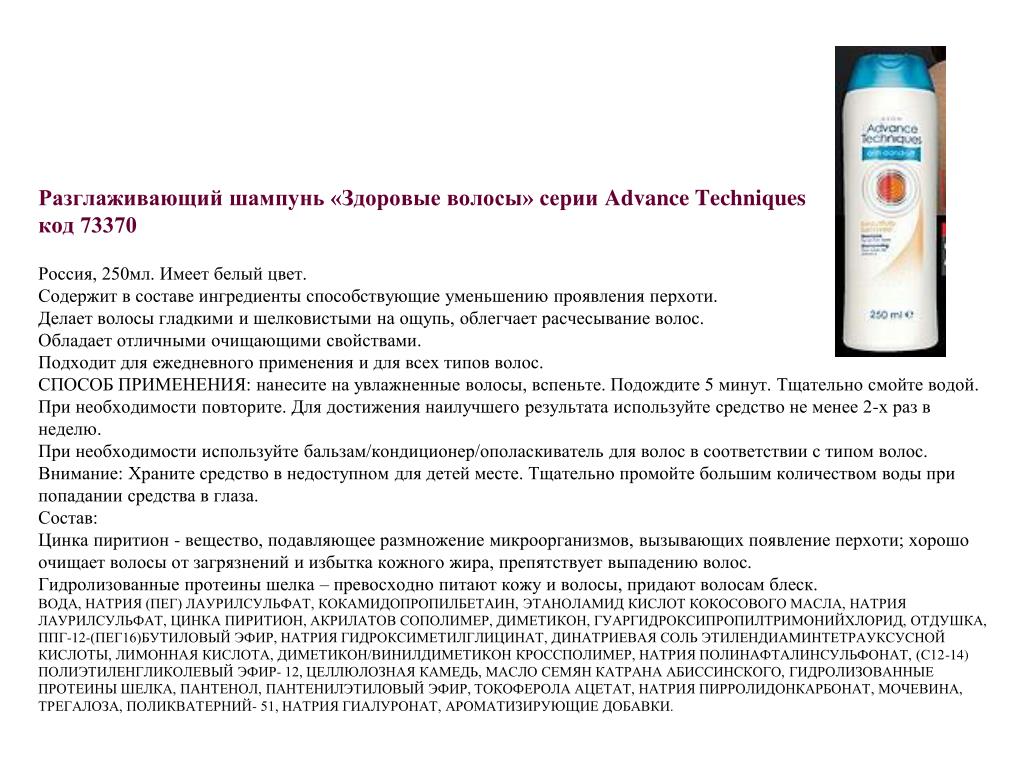 Разглаживающий шампунь «Здоровые волосы» серии Advance Techniquesкод 73370Россия, 250мл. Имеет белый цвет.Содержит в составе ингредиенты способствующие уменьшению проявления перхоти. Делает волосы гладкими и шелковистыми на ощупь, облегчает расчесывание волос. Обладает отличными очищающими свойствами. Подходит для ежедневного применения и для всех типов волос.СПОСОБ ПРИМЕНЕНИЯ: нанесите на увлажненные волосы, вспеньте. Подождите 5 минут. Тщательно смойте водой. При необходимости повторите. Для достижения наилучшего результата используйте средство не менее 2-х раз в неделю. При необходимости используйте бальзам/кондиционер/ополаскиватель для волос в соответствии с типом волос.Внимание: Храните средство в недоступном для детей месте. Тщательно промойте большим количеством воды при попадании средства в глаза.Состав:Цинка пиритион - вещество, подавляющее размножение микроорганизмов, вызывающих появление перхоти; хорошо очищает волосы от загрязнений и избытка кожного жира, препятствует выпадению волос. Гидролизованные протеины шелка – превосходно питают кожу и волосы, придают волосам блеск.ВОДА, НАТРИЯ (ПЕГ) ЛАУРИЛСУЛЬФАТ, КОКАМИДОПРОПИЛБЕТАИН, ЭТАНОЛАМИД КИСЛОТ КОКОСОВОГО МАСЛА, НАТРИЯ ЛАУРИЛСУЛЬФАТ, ЦИНКА ПИРИТИОН, АКРИЛАТОВ СОПОЛИМЕР, ДИМЕТИКОН, ГУАРГИДРОКСИПРОПИЛТРИМОНИЙХЛОРИД, ОТДУШКА, ППГ-12-(ПЕГ16)БУТИЛОВЫЙ ЭФИР, НАТРИЯ ГИДРОКСИМЕТИЛГЛИЦИНАТ, ДИНАТРИЕВАЯ СОЛЬ ЭТИЛЕНДИАМИНТЕТРАУКСУСНОЙ КИСЛОТЫ, ЛИМОННАЯ КИСЛОТА, ДИМЕТИКОН/ВИНИЛДИМЕТИКОН КРОССПОЛИМЕР, НАТРИЯ ПОЛИНАФТАЛИНСУЛЬФОНАТ, (С12-14) ПОЛИЭТИЛЕНГЛИКОЛЕВЫЙ ЭФИР- 12, ЦЕЛЛЮЛОЗНАЯ КАМЕДЬ, МАСЛО СЕМЯН КАТРАНА АБИССИНСКОГО, ГИДРОЛИЗОВАННЫЕ ПРОТЕИНЫ ШЕЛКА, ПАНТЕНОЛ, ПАНТЕНИЛЭТИЛОВЫЙ ЭФИР, ТОКОФЕРОЛА АЦЕТАТ, НАТРИЯ ПИРРОЛИДОНКАРБОНАТ, МОЧЕВИНА, ТРЕГАЛОЗА, ПОЛИКВАТЕРНИЙ- 51, НАТРИЯ ГИАЛУРОНАТ, АРОМАТИЗИРУЮЩИЕ ДОБАВКИ.