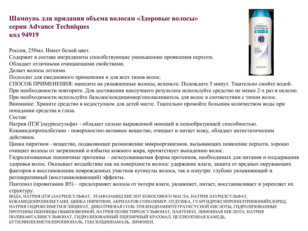 Шампунь для придания объема волосам «Здоровые волосы» серии Advance Techniquesкод 94919Россия, 250мл. Имеет белый цвет.Содержит в составе ингредиенты способствующие уменьшению проявления перхоти. Обладает отличными очищающими свойствами. Делает волосы легкими.Подходит для ежедневного применения и для всех типов волос.СПОСОБ ПРИМЕНЕНИЯ: нанесите на увлажненные волосы, вспеньте. Подождите 5 минут. Тщательно смойте водой. При необходимости повторите. Для достижения наилучшего результата используйте средство не менее 2-х раз в неделю. При необходимости используйте бальзам/кондиционер/ополаскиватель для волос в соответствии с типом волос.Внимание: Храните средство в недоступном для детей месте. Тщательно промойте большим количеством воды при попадании средства в глаза.Состав:Натрия (ПЭГ)лаурилсульфат - обладает сильно выраженной моющей и пенообразующей способностью.Кокамидопропилбетаин - поверхностно-активное вещество, очищает и питает кожу, обладает антистатическим действием.Цинка пиритион - вещество, подавляющее размножение микроорганизмов, вызывающих появление перхоти, хорошо очищает волосы от загрязнений и избытка кожного жира, препятствует выпадению волос.Гидролизованные пшеничные протеины – легкоусваиваемая форма протеинов, необходимых для питания и поддержания здоровья волос. Оказывает воздействие как на поверхности волоса: удержание влаги, защита от вредных окружающих факторов и восстановление поврежденных участков кутикулы волоса, так и изнутри: глубоко увлажняющий и регенеративный (восстанавливающий) эффекты.Пантенол (провитамин В5) – предохраняет волосы от потери влаги, увлажняет, питает, восстанавливает и укрепляет их структуру.ВОДА, НАТРИЯ (ПЭГ)ЛАУРИЛСУЛЬФАТ, ЭТАНОЛАМИД КИСЛОТ КОКОСОВОГО МАСЛА, НАТРИЯ ЛАУРИЛСУЛЬФАТ, КОКАМИДОПРОПИЛБЕТАИН, ЦИНКА ПИРИТИОН, АКРИЛАТОВ СОПОЛИМЕР, ОТДУШКА, ГУАРГИДРОКСИПРОПИЛТРИМОНИЙХЛОРИД, НАТРИЯ ГИДРОКСИМЕТИЛГЛИЦИНАТ, ДИНАТРИЕВАЯ СОЛЬ ЭТИЛЕНДИАМИНТЕТРАУКСУСНОЙ КИСЛОТЫ, ГИДРОЛИЗОВАННЫЕ ПРОТЕИНЫ ПШЕНИЦЫ ОБЫКНОВЕННОЙ, НАТРИЯ ПОЛИСТИРОЛСУЛЬФОНАТ, ПАНТЕНОЛ, ЛИМОННАЯ КИСЛОТА, НАТРИЯ ПОЛИНАФТАЛИНСУЛЬФОНАТ, ГИДРОЛИЗОВАННЫЙ ПШЕНИЧНЫЙ КРАХМАЛ, ЦЕЛЛЮЛОЗНАЯ КАМЕДЬ, БУТИЛФЕНИЛМЕТИЛПРОПИОНАЛЬ, ГЕКСИЛЦИННАМАЛЬ, ЛИМОНЕН.