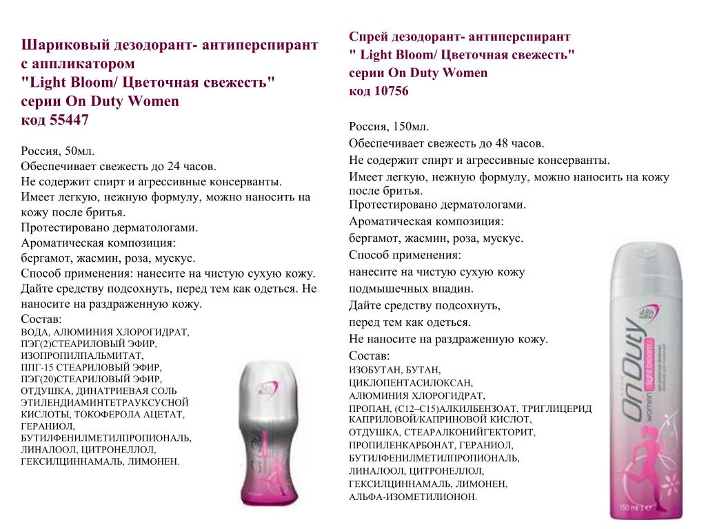 Шариковый дезодорант- антиперспирант с аппликатором "Light Bloom/ Цветочная свежесть" серии On Duty Womenкод 55447Россия, 50мл.Обеспечивает свежесть до 24 часов.Не содержит спирт и агрессивные консерванты.Имеет легкую, нежную формулу, можно наносить на кожу после бритья.Протестировано дерматологами. Ароматическая композиция:бергамот, жасмин, роза, мускус.Способ применения: нанесите на чистую сухую кожу. Дайте средству подсохнуть, перед тем как одеться. Не наносите на раздраженную кожу.Состав:ВОДА, АЛЮМИНИЯ ХЛОРОГИДРАТ, ПЭГ(2)СТЕАРИЛОВЫЙ ЭФИР, ИЗОПРОПИЛПАЛЬМИТАТ, ППГ-15 СТЕАРИЛОВЫЙ ЭФИР, ПЭГ(20)СТЕАРИЛОВЫЙ ЭФИР, ОТДУШКА, ДИНАТРИЕВАЯ СОЛЬ ЭТИЛЕНДИАМИНТЕТРАУКСУСНОЙ КИСЛОТЫ, ТОКОФЕРОЛА АЦЕТАТ,ГЕРАНИОЛ, БУТИЛФЕНИЛМЕТИЛПРОПИОНАЛЬ, ЛИНАЛООЛ, ЦИТРОНЕЛЛОЛ, ГЕКСИЛЦИННАМАЛЬ, ЛИМОНЕН. Спрей дезодорант- антиперспирант " Light Bloom/ Цветочная свежесть" серии On Duty Women код 10756 Россия, 150мл. Обеспечивает свежесть до 48 часов. Не содержит спирт и агрессивные консерванты. Имеет легкую, нежную формулу, можно наносить на кожу после бритья.Протестировано дерматологами. Ароматическая композиция: бергамот, жасмин, роза, мускус. Способ применения: нанесите на чистую сухую кожу подмышечных впадин. Дайте средству подсохнуть, перед тем как одеться. Не наносите на раздраженную кожу. Состав: ИЗОБУТАН, БУТАН, ЦИКЛОПЕНТАСИЛОКСАН, АЛЮМИНИЯ ХЛОРОГИДРАТ, ПРОПАН, (С12–С15)АЛКИЛБЕНЗОАТ, ТРИГЛИЦЕРИД КАПРИЛОВОЙ/КАПРИНОВОЙ КИСЛОТ, ОТДУШКА, СТЕАРАЛКОНИЙГЕКТОРИТ, ПРОПИЛЕНКАРБОНАТ, ГЕРАНИОЛ, БУТИЛФЕНИЛМЕТИЛПРОПИОНАЛЬ, ЛИНАЛООЛ, ЦИТРОНЕЛЛОЛ, ГЕКСИЛЦИННАМАЛЬ, ЛИМОНЕН, АЛЬФА-ИЗОМЕТИЛИОНОН.