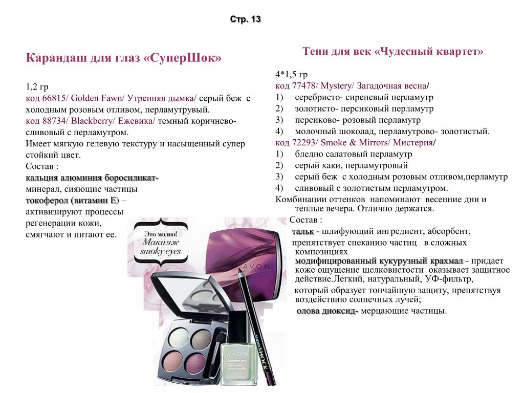 Стр. 13 Карандаш для глаз «СуперШок»1,2 гркод 66815/ Golden Fawn/ Утренняя дымка/ серый беж с холодным розовым отливом, перламутрувый.код 88734/ Blackberry/ Ежевика/ темный коричнево- сливовый с перламутром.Имеет мягкую гелевую текстуру и насыщенный супер стойкий цвет. Состав :кальция алюминия боросиликат- минерал, сияющие частицы токоферол (витамин Е) – активизируют процессы регенерации кожи, смягчают и питают ее. Тени для век «Чудесный квартет» 4*1,5 гр код 77478/ Mystery/ Загадочная весна/ • серебристо- сиреневый перламутр • золотисто- персиковый перламутр • персиково- розовый перламутр • молочный шоколад, перламутрово- золотистый. код 72293/ Smoke & Mirrors/ Мистерия/ • бледно салатовый перламутр • серый хаки, перламутровый • серый беж с холодным розовым отливом,перламутр • сливовый с золотистым перламутром. Комбинации оттенков напоминают весенние дни и теплые вечера. Отлично держатся. Состав : тальк - шлифующий ингредиент, абсорбент, препятствует спеканию частиц в сложных композицияхмодифицированный кукурузный крахмал - придает коже ощущение шелковистости оказывает защитное действие.Легкий, натуральный, УФ-фильтр, который образует тончайшую защиту, препятствуя воздействию солнечных лучей; олова диоксид- мерцающие частицы.