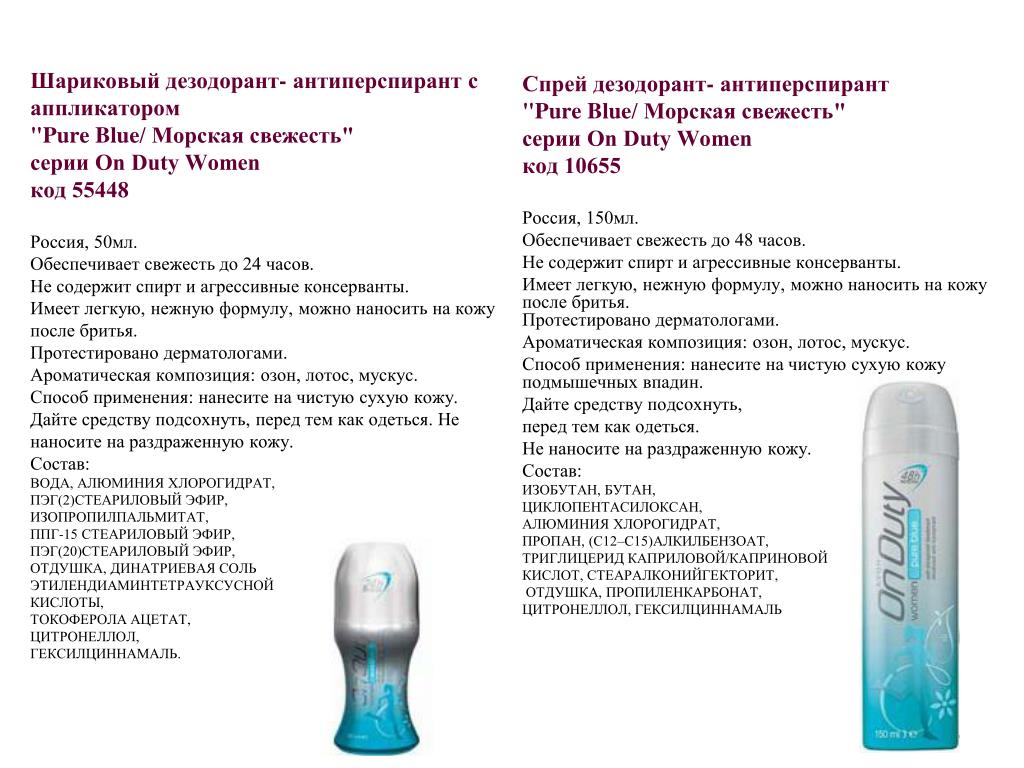 Шариковый дезодорант- антиперспирант с аппликатором "Pure Blue/ Морская свежесть" серии On Duty Womenкод 55448Россия, 50мл.Обеспечивает свежесть до 24 часов.Не содержит спирт и агрессивные консерванты.Имеет легкую, нежную формулу, можно наносить на кожу после бритья.Протестировано дерматологами.Ароматическая композиция: озон, лотос, мускус.Способ применения: нанесите на чистую сухую кожу. Дайте средству подсохнуть, перед тем как одеться. Не наносите на раздраженную кожу.Состав:ВОДА, АЛЮМИНИЯ ХЛОРОГИДРАТ, ПЭГ(2)СТЕАРИЛОВЫЙ ЭФИР, ИЗОПРОПИЛПАЛЬМИТАТ, ППГ-15 СТЕАРИЛОВЫЙ ЭФИР, ПЭГ(20)СТЕАРИЛОВЫЙ ЭФИР, ОТДУШКА, ДИНАТРИЕВАЯ СОЛЬ ЭТИЛЕНДИАМИНТЕТРАУКСУСНОЙ КИСЛОТЫ, ТОКОФЕРОЛА АЦЕТАТ, ЦИТРОНЕЛЛОЛ, ГЕКСИЛЦИННАМАЛЬ. Спрей дезодорант- антиперспирант "Pure Blue/ Морская свежесть" серии On Duty Women код 10655 Россия, 150мл. Обеспечивает свежесть до 48 часов. Не содержит спирт и агрессивные консерванты. Имеет легкую, нежную формулу, можно наносить на кожу после бритья.Протестировано дерматологами. Ароматическая композиция: озон, лотос, мускус. Способ применения: нанесите на чистую сухую кожу подмышечных впадин. Дайте средству подсохнуть, перед тем как одеться. Не наносите на раздраженную кожу. Состав: ИЗОБУТАН, БУТАН, ЦИКЛОПЕНТАСИЛОКСАН, АЛЮМИНИЯ ХЛОРОГИДРАТ, ПРОПАН, (С12–С15)АЛКИЛБЕНЗОАТ, ТРИГЛИЦЕРИД КАПРИЛОВОЙ/КАПРИНОВОЙ КИСЛОТ, СТЕАРАЛКОНИЙГЕКТОРИТ, ОТДУШКА, ПРОПИЛЕНКАРБОНАТ, ЦИТРОНЕЛЛОЛ, ГЕКСИЛЦИННАМАЛЬ