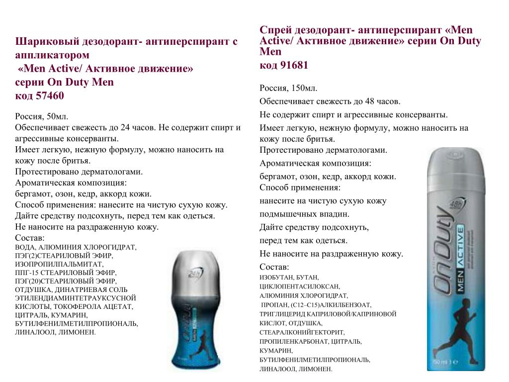 Шариковый дезодорант- антиперспирант с аппликатором «Men Active/ Активное движение» серии On Duty Men код 57460Россия, 50мл.Обеспечивает свежесть до 24 часов. Не содержит спирт и агрессивные консерванты.Имеет легкую, нежную формулу, можно наносить на кожу после бритья.Протестировано дерматологами. Ароматическая композиция: бергамот, озон, кедр, аккорд кожи.Способ применения: нанесите на чистую сухую кожу. Дайте средству подсохнуть, перед тем как одеться. Не наносите на раздраженную кожу.Состав:ВОДА, АЛЮМИНИЯ ХЛОРОГИДРАТ, ПЭГ(2)СТЕАРИЛОВЫЙ ЭФИР, ИЗОПРОПИЛПАЛЬМИТАТ, ППГ-15 СТЕАРИЛОВЫЙ ЭФИР, ПЭГ(20)СТЕАРИЛОВЫЙ ЭФИР, ОТДУШКА, ДИНАТРИЕВАЯ СОЛЬ ЭТИЛЕНДИАМИНТЕТРАУКСУСНОЙ КИСЛОТЫ, ТОКОФЕРОЛА АЦЕТАТ, ЦИТРАЛЬ, КУМАРИН, БУТИЛФЕНИЛМЕТИЛПРОПИОНАЛЬ, ЛИНАЛООЛ, ЛИМОНЕН. Спрей дезодорант- антиперспирант «Men Active/ Активное движение» серии On Duty Men код 91681 Россия, 150мл. Обеспечивает свежесть до 48 часов. Не содержит спирт и агрессивные консерванты. Имеет легкую, нежную формулу, можно наносить на кожу после бритья.Протестировано дерматологами. Ароматическая композиция: бергамот, озон, кедр, аккорд кожи.Способ применения: нанесите на чистую сухую кожу подмышечных впадин. Дайте средству подсохнуть, перед тем как одеться. Не наносите на раздраженную кожу. Состав: ИЗОБУТАН, БУТАН, ЦИКЛОПЕНТАСИЛОКСАН, АЛЮМИНИЯ ХЛОРОГИДРАТ, ПРОПАН, (С12–С15)АЛКИЛБЕНЗОАТ, ТРИГЛИЦЕРИД КАПРИЛОВОЙ/КАПРИНОВОЙ КИСЛОТ, ОТДУШКА, СТЕАРАЛКОНИЙГЕКТОРИТ, ПРОПИЛЕНКАРБОНАТ, ЦИТРАЛЬ, КУМАРИН, БУТИЛФЕНИЛМЕТИЛПРОПИОНАЛЬ, ЛИНАЛООЛ, ЛИМОНЕН.