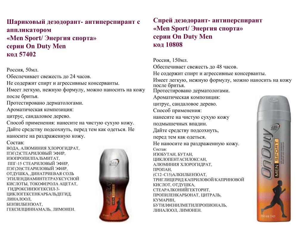 Шариковый дезодорант- антиперспирант с аппликатором «Men Sport/ Энергия спорта» серии On Duty Men код 57402Россия, 50мл.Обеспечивает свежесть до 24 часов.Не содержит спирт и агрессивные консерванты.Имеет легкую, нежную формулу, можно наносить на кожу после бритья.Протестировано дерматологами. Ароматическая композиция: цитрус, сандаловое дерево.Способ применения: нанесите на чистую сухую кожу. Дайте средству подсохнуть, перед тем как одеться. Не наносите на раздраженную кожу.Состав:ВОДА, АЛЮМИНИЯ ХЛОРОГИДРАТ, ПЭГ(2)СТЕАРИЛОВЫЙ ЭФИР, ИЗОПРОПИЛПАЛЬМИТАТ, ППГ-15 СТЕАРИЛОВЫЙ ЭФИР, ПЭГ(20)СТЕАРИЛОВЫЙ ЭФИР, ОТДУШКА, ДИНАТРИЕВАЯ СОЛЬ ЭТИЛЕНДИАМИНТЕТРАУКСУСНОЙ КИСЛОТЫ, ТОКОФЕРОЛА АЦЕТАТ, ГИДРОКСИИЗОГЕКСИЛ-3-ЦИКЛОГЕКСЕНКАРБАЛЬДЕГИД, ЛИНАЛООЛ, БЕНЗИЛБЕНЗОАТ, ГЕКСИЛЦИННАМАЛЬ, ЛИМОНЕН. Спрей дезодорант- антиперспирант «Men Sport/ Энергия спорта» серии On Duty Men код 10808 Россия, 150мл. Обеспечивает свежесть до 48 часов. Не содержит спирт и агрессивные консерванты. Имеет легкую, нежную формулу, можно наносить на кожу после бритья.Протестировано дерматологами. Ароматическая композиция: цитрус, сандаловое дерево. Способ применения: нанесите на чистую сухую кожу подмышечных впадин. Дайте средству подсохнуть, перед тем как одеться. Не наносите на раздраженную кожу. Состав: ИЗОБУТАН, БУТАН, ЦИКЛОПЕНТАСИЛОКСАН, АЛЮМИНИЯ ХЛОРОГИДРАТ, ПРОПАН, (С12–С15)АЛКИЛБЕНЗОАТ, ТРИГЛИЦЕРИД КАПРИЛОВОЙ/КАПРИНОВОЙ КИСЛОТ, ОТДУШКА, СТЕАРАЛКОНИЙГЕКТОРИТ, ПРОПИЛЕНКАРБОНАТ, ЦИТРАЛЬ, КУМАРИН, БУТИЛФЕНИЛМЕТИЛПРОПИОНАЛЬ, ЛИНАЛООЛ, ЛИМОНЕН.