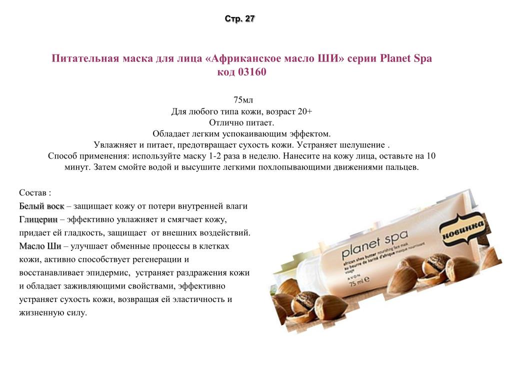 Стр. 27 Питательная маска для лица «Африканское масло ШИ» серии Planet Spa код 0316075млДля любого типа кожи, возраст 20+Отлично питает. Обладает легким успокаивающим эффектом.Увлажняет и питает, предотвращает сухость кожи. Устраняет шелушение .Способ применения: используйте маску 1-2 раза в неделю. Нанесите на кожу лица, оставьте на 10 минут. Затем смойте водой и высушите легкими похлопывающими движениями пальцев. Состав : Белый воск – защищает кожу от потери внутренней влаги Глицерин – эффективно увлажняет и смягчает кожу, придает ей гладкость, защищает от внешних воздействий. Масло Ши – улучшает обменные процессы в клетках кожи, активно способствует регенерации и восстанавливает эпидермис, устраняет раздражения кожи и обладает заживляющими свойствами, эффективно устраняет сухость кожи, возвращая ей эластичность и жизненную силу.