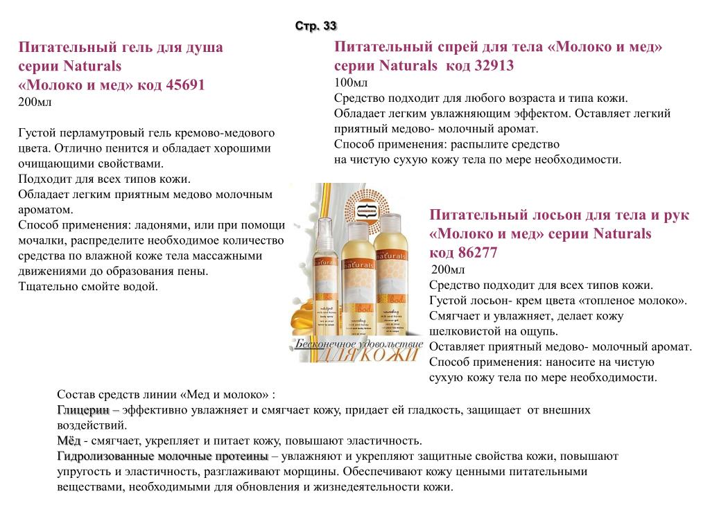 Питательный гель для душа серии Naturals «Молоко и мед» код 45691 200мл Густой перламутровый гель кремово-медового цвета. Отлично пенится иобладает хорошими очищающими свойствами. Подходит для всех типов кожи. Обладает легким приятным медово молочным ароматом. Способ применения: ладонями, или при помощи мочалки, распределите необходимое количество средства по влажной коже тела массажными движениями до образования пены. Тщательно смойте водой. Питательный лосьон для тела и рук «Молоко и мед» серии Naturals код 86277 200мл Средство подходит для всех типов кожи. Густой лосьон- крем цвета «топленое молоко». Смягчает и увлажняет, делает кожу шелковистой на ощупь. Оставляет приятный медово- молочный аромат. Способ применения: наносите на чистую сухую кожу тела по мере необходимости. Стр. 33 Питательный спрей для тела «Молоко и мед» серии Naturals код 32913100млСредство подходит для любого возраста и типа кожи.Обладает легким увлажняющим эффектом. Оставляет легкий приятный медово- молочный аромат.Способ применения: распылите средство на чистую сухую кожу тела по мере необходимости. Состав средств линии «Мед и молоко» : Глицерин – эффективно увлажняет и смягчает кожу, придает ей гладкость, защищает от внешнихвоздействий. Мёд - смягчает, укрепляет и питает кожу, повышают эластичность. Гидролизованные молочные протеины – увлажняют и укрепляютзащитные свойства кожи, повышают упругость и эластичность,разглаживают морщины. Обеспечивают кожу ценнымипитательными веществами, необходимыми для обновления ижизнедеятельности кожи.