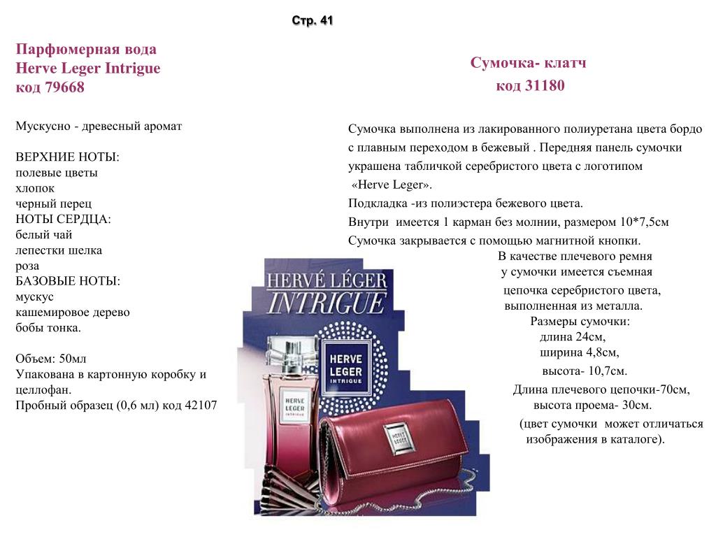 Стр. 41 ПарфюмернаяводаHerve Leger Intrigue код 79668Мускусно - древесный аромат ВЕРХНИЕ НОТЫ: полевые цветы хлопокчерный перецНОТЫ СЕРДЦА: белый чайлепестки шелкарозаБАЗОВЫЕ НОТЫ: мускускашемировое деревобобы тонка.Объем: 50млУпакована в картонную коробку и целлофан.Пробный образец (0,6 мл) код 42107 Сумочка- клатч код 31180 Сумочка выполнена из лакированного полиуретана цвета бордо с плавным переходом в бежевый . Передняя панель сумочки украшена табличкой серебристого цвета с логотипом «Herve Leger». Подкладка -из полиэстера бежевого цвета. Внутри имеется 1 карман без молнии, размером 10*7,5см Сумочка закрывается с помощью магнитной кнопки. В качестве плечевого ремня у сумочки имеется съемная цепочка серебристого цвета, выполненная из металла. Размеры сумочки: длина 24см, ширина 4,8см, высота- 10,7см. Длина плечевого цепочки-70см, высота проема- 30см. (цвет сумочки может отличаться от изображения в каталоге).
