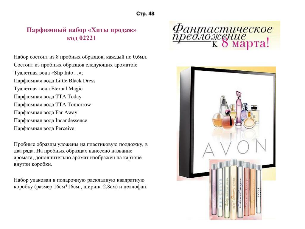 Парфюмный набор «Хиты продаж» код 02221 Набор состоит из 8 пробных образцов, каждый по 0,6мл. Состоит из пробных образцов следующих ароматов: Туалетнаявода «Slip Into…»; ПарфюмнаяводаLittle Black Dress Туалетная вода Eternal Magic Парфюмная вода TTA Today Парфюмная вода TTA Tomorrow Парфюмная вода Far Away Парфюмная вода Incandessence Парфюмная вода Perceive. Пробные образцы уложены на пластиковую подложку, в два ряда. На пробных образцах нанесено название аромата, дополнительно аромат изображен на картоне внутри коробки. Набор упакован в подарочную раскладную квадратную коробку (размер 16см*16см., ширина 2,8см) и целлофан. Стр. 48