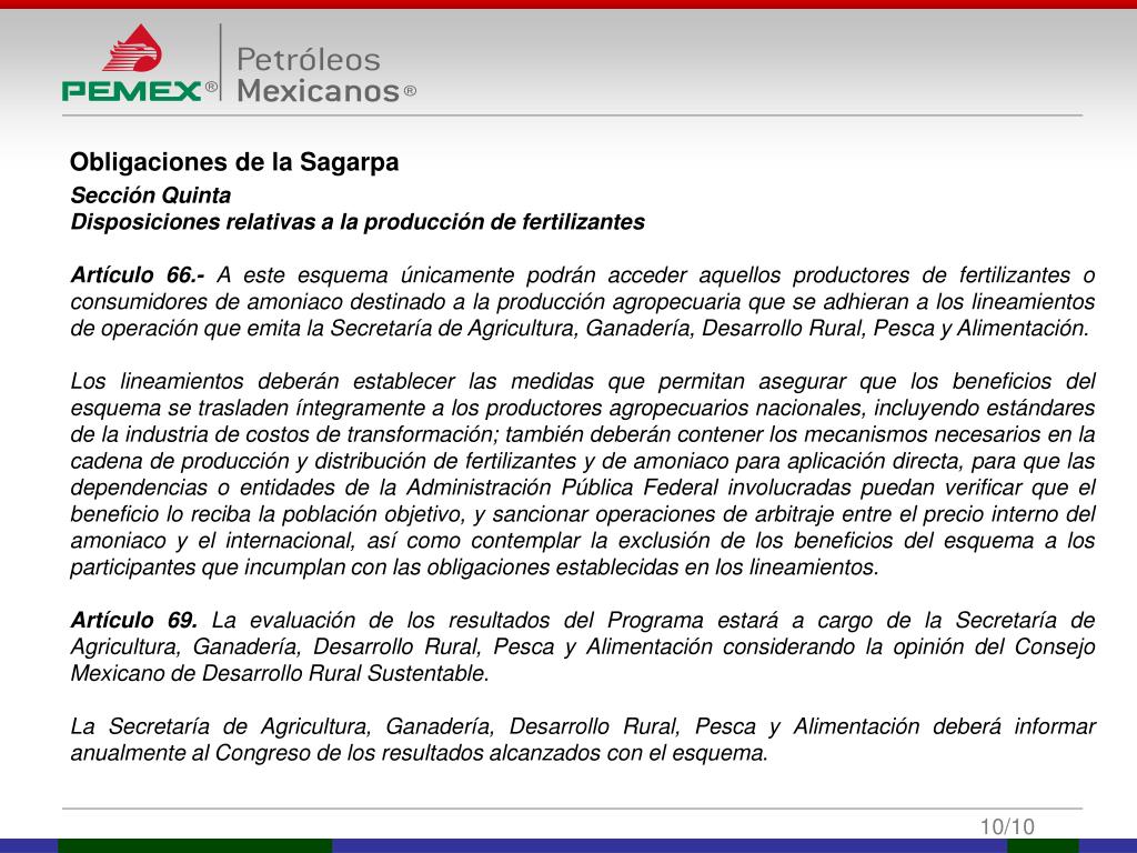Obligaciones de la Sagarpa Sección Quinta Disposiciones relativas a la producción de fertilizantes Artículo 66.- A este esquema únicamente podrán acceder aquellos productores de fertilizantes o consumidores de amoniaco destinado a la producción agropecuaria que se adhieran a los lineamientos de operación que emita la Secretaría de Agricultura, Ganadería, Desarrollo Rural, Pesca y Alimentación. Los lineamientos deberán establecer las medidas que permitan asegurar que los beneficios del esquema se trasladen íntegramente a los productores agropecuarios nacionales, incluyendo estándares de la industria de costos de transformación; también deberán contener los mecanismos necesarios en la cadena de producción y distribución de fertilizantes y de amoniaco para aplicación directa, para que las dependencias o entidades de la Administración Pública Federal involucradas puedan verificar que el beneficio lo reciba la población objetivo, y sancionar operaciones de arbitraje entre el precio interno del amoniaco y el internacional, así como contemplar la exclusión de los beneficios del esquema a los participantes que incumplan con las obligaciones establecidas en los lineamientos. Artículo 69. La evaluación de los resultados del Programa estará a cargo de la Secretaría de Agricultura, Ganadería, Desarrollo Rural, Pesca y Alimentación considerando la opinión del Consejo Mexicano de Desarrollo Rural Sustentable. La Secretaría de Agricultura, Ganadería, Desarrollo Rural, Pesca y Alimentación deberá informar anualmente al Congreso de los resultados alcanzados con el esquema.