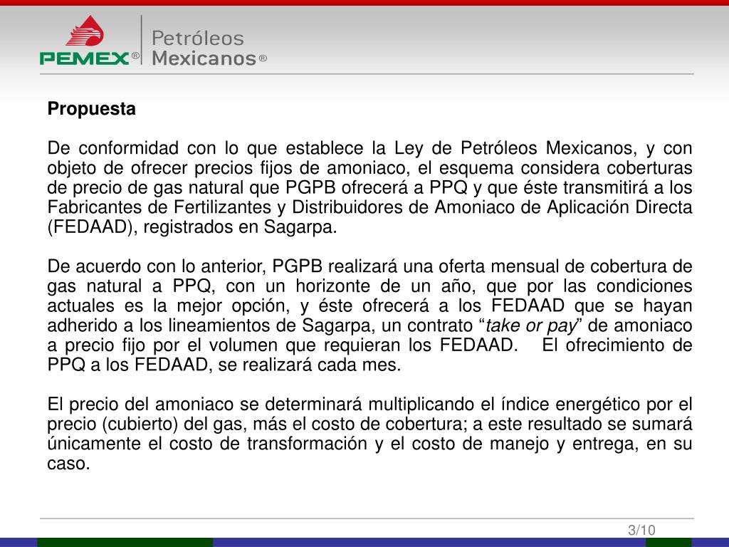 Propuesta De conformidad con lo que establece la Ley de Petróleos Mexicanos, y con objeto de ofrecer precios fijos de amoniaco, el esquema considera coberturas de precio de gas natural que PGPB ofrecerá a PPQ y que éste transmitirá a los Fabricantes de Fertilizantes y Distribuidores de Amoniaco de Aplicación Directa (FEDAAD), registrados en Sagarpa. De acuerdo con lo anterior, PGPB realizará una oferta mensual de cobertura de gas natural a PPQ, con un horizonte de un año, que por las condiciones actuales es la mejor opción, y éste ofrecerá a los FEDAAD que se hayan adherido a los lineamientos de Sagarpa, un contrato “take or pay” de amoniaco a precio fijo por el volumen que requieran los FEDAAD. El ofrecimiento de PPQ a los FEDAAD, se realizará cada mes. El precio del amoniaco se determinará multiplicando el índice energético por el precio (cubierto) del gas, más el costo de cobertura; a este resultado se sumará únicamente el costo de transformación y el costo de manejo y entrega, en su caso.