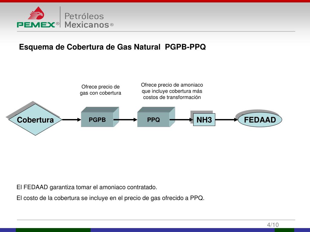 Esquema de Cobertura de Gas Natural PGPB-PPQ Ofrece precio de amoniaco que incluye cobertura más costos de transformación Ofrece precio de gas con cobertura Cobertura PGPB PPQ FEDAAD NH3 El FEDAAD garantiza tomar el amoniaco contratado. El costo de la cobertura se incluye en el precio de gas ofrecido a PPQ.