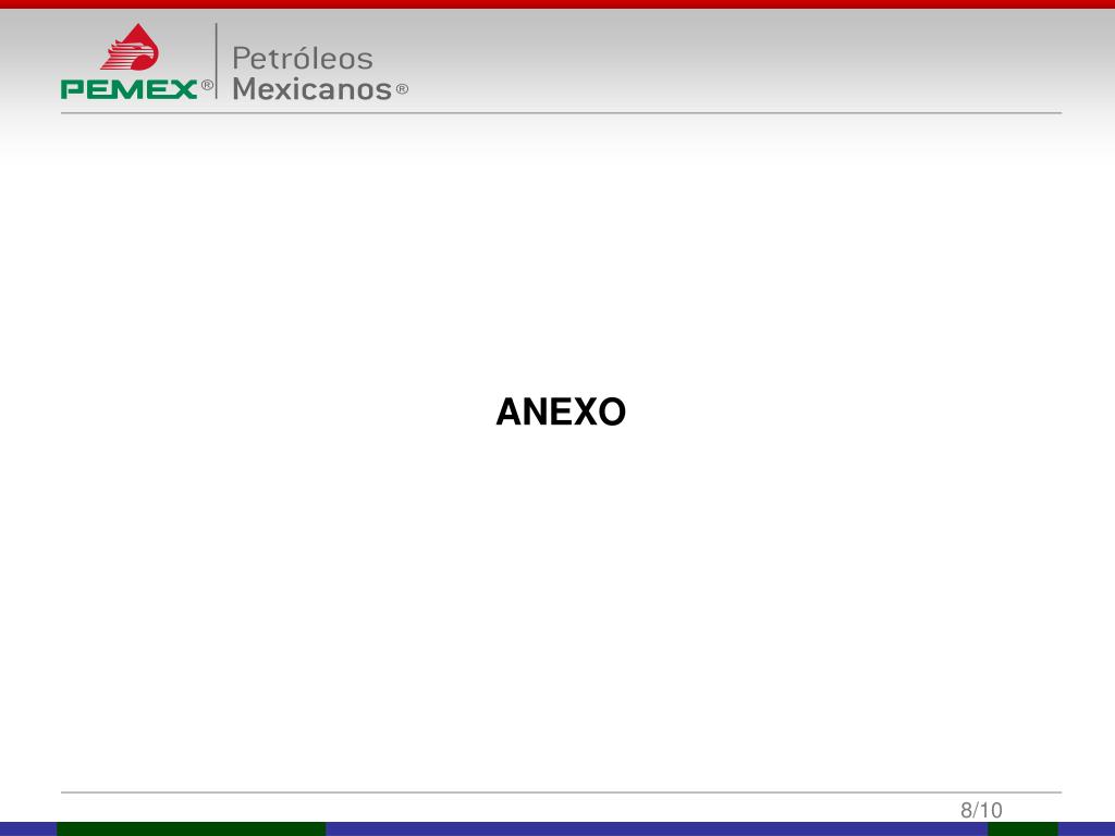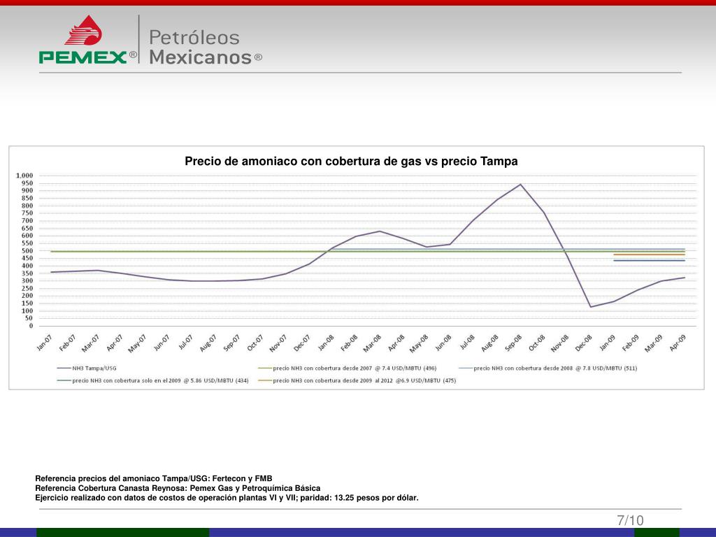 CALCULO DEL PRECIO DE VENTA DEL AMONIACO Para efectos ilustrativos, a continuación se presenta cuál sería el precio de venta, que resulta de la aplicación del esquema propuesto. • Índice energético* 40.3 • Multiplicado por el precio del gas, más el costo** 5.0 de la cobertura • Más el costo de transformación (Dólares/tonelada) 197.6 • PRECIO (Dólares/tonelada) 399.1 NOTAS: • El costo de transformación se obtiene de los estados de resultados de PPQ al cierre de 2008, considerando un tipo de cambio de 13.25 pesos por dólar. El costo de transformación que se incluirá en el precio de venta de amoniaco, será determinado por la Secretaría de Hacienda, en el seno del Comité de Precios de Petróleos Mexicanos. • El precio resultante corresponde al producto puesto en Cosoleacaque. * Millones de BTU´s requeridos para la producción de una tonelada de amoniaco. ** Precio de cobertura (fijo) para julio 2009 a junio 2010. Referencia mercado del Sur de Texas (TETCO).