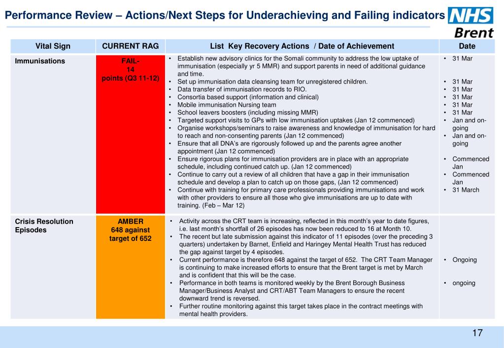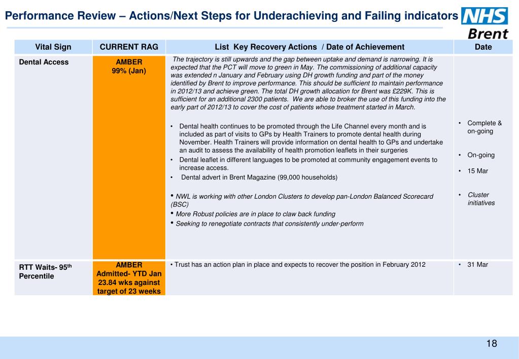 NHS Brent Performance Board Report Month 11 March 2012. Jonathan Wise Director of Finance and Performance. Contents. Slides 3 - 6 Performance Delivery – overall summary Slides 7 - 12 2011/12 Performance Delivery Slides 13 - 19 Performance Review – Actions/Next Steps Appendices