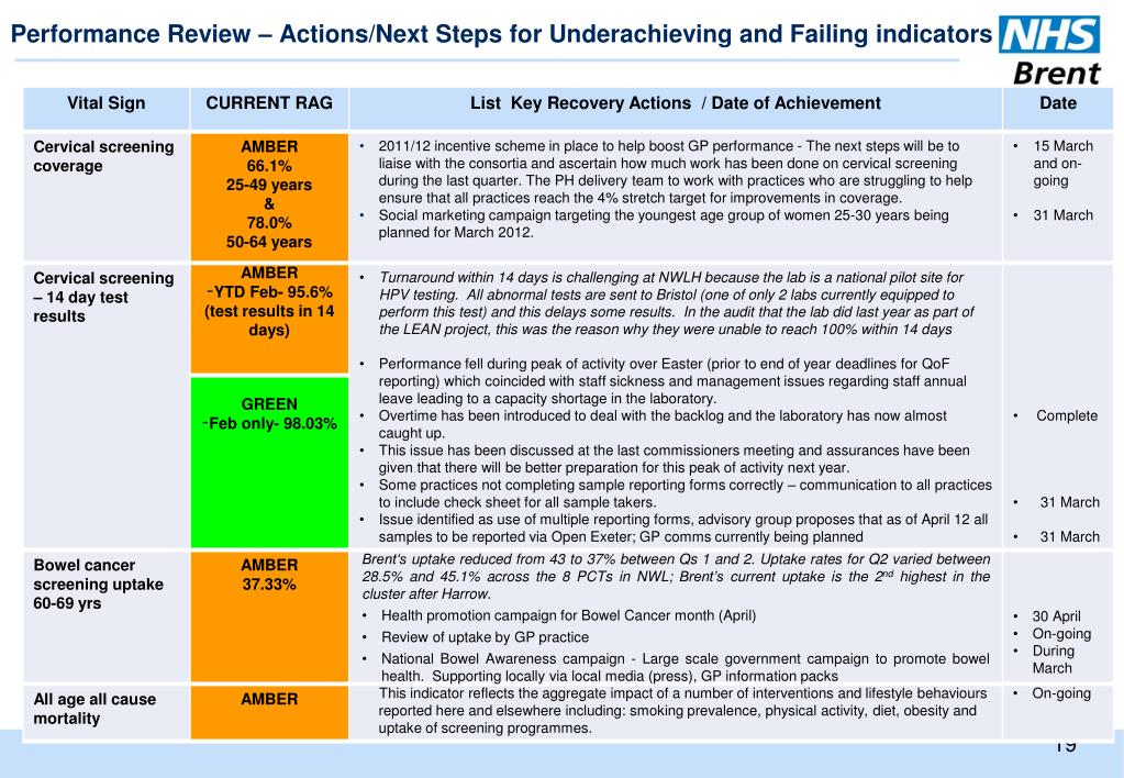 2011/12 Performance Delivery - Summary (4)Public Health Measures (underachieve & failing) Cervical screening 1 = 25-49 years 2 = 50-64years