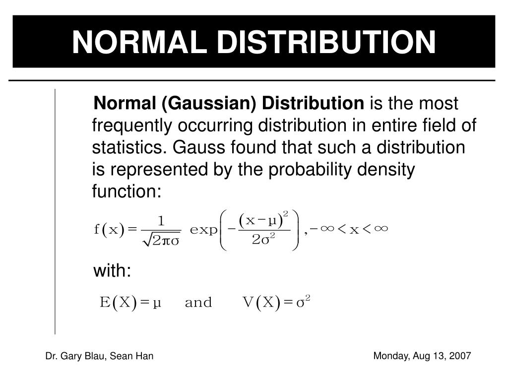 NORMAL DISTRIBUTION Normal (Gaussian) Distribution is the most frequently occurring distribution in entire field of statistics. Gauss found that such a distribution is represented by the probability density function: with: Dr. Gary Blau, Sean Han