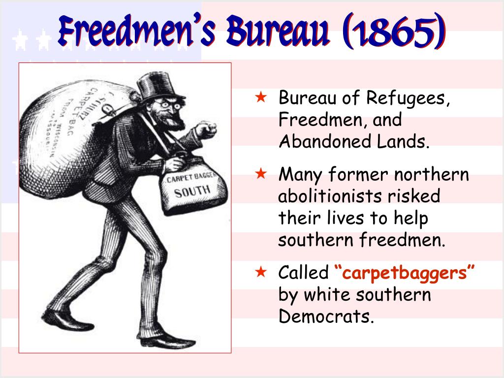 Freedmen’s Bureau (1865) • Bureau of Refugees, Freedmen, and Abandoned Lands. • Many former northern abolitionists risked their lives to help southern freedmen. • Called “carpetbaggers” by white southern Democrats.