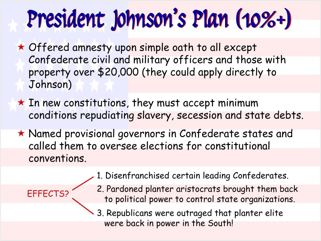 President Johnson’s Plan (10%+) • Offered amnesty upon simple oath to all except Confederate civil and military officers and those with property over $20,000 (they could apply directly to Johnson) • In new constitutions, they must accept minimumconditions repudiating slavery, secession and state debts. • Named provisional governors in Confederate states and called them to oversee elections for constitutional conventions. 1. Disenfranchised certain leading Confederates. 2. Pardoned planter aristocrats brought them back to political power to control state organizations. EFFECTS? 3. Republicans were outraged that planter elite were back in power in the South!