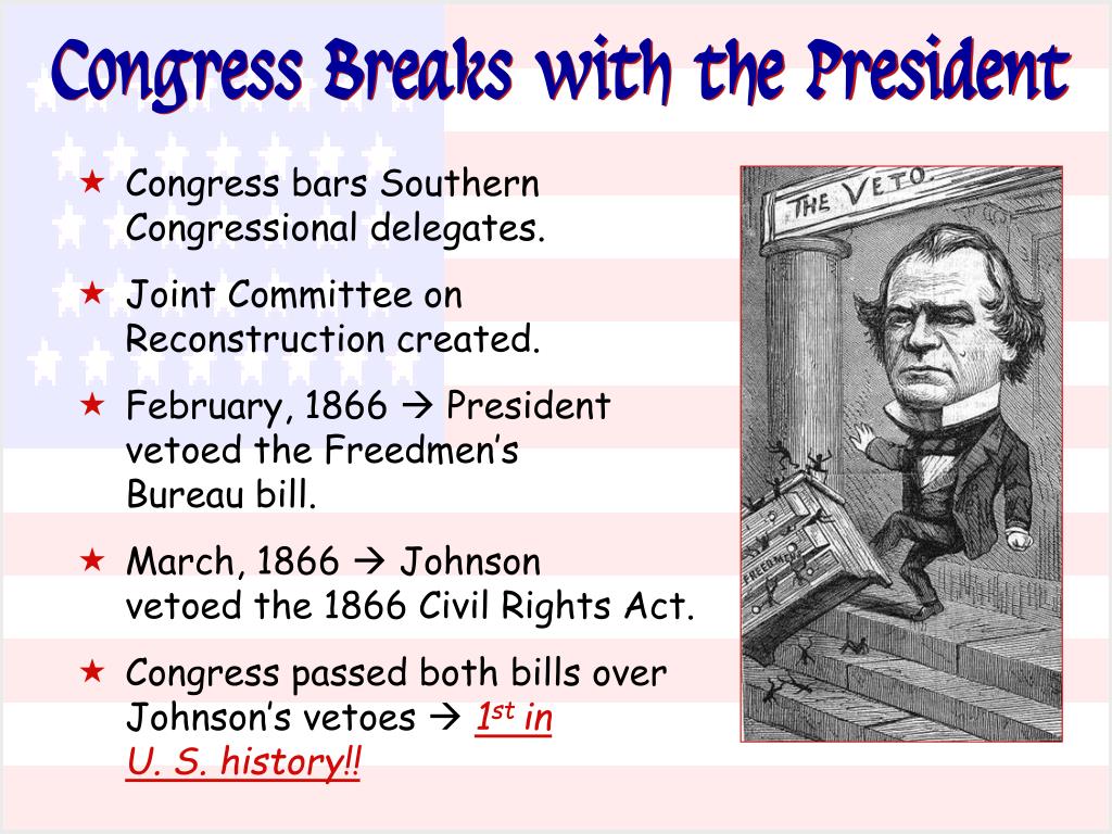 Congress Breaks with the President • Congress bars SouthernCongressional delegates. • Joint Committee on Reconstruction created. • February, 1866 Presidentvetoed the Freedmen’sBureau bill. • March, 1866 Johnsonvetoed the 1866 Civil Rights Act. • Congress passed both bills over Johnson’s vetoes 1st in U. S. history!!