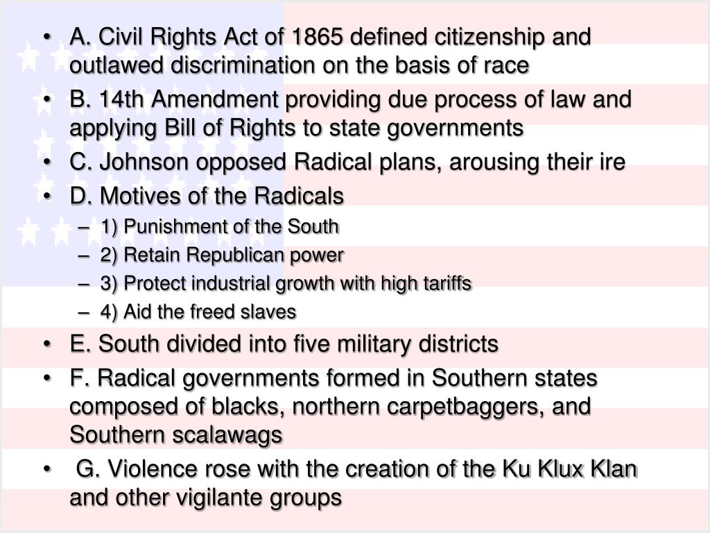 A. Civil Rights Act of 1865 defined citizenship and outlawed discrimination on the basis of race • B. 14th Amendment providing due process of law and applying Bill of Rights to state governments • C. Johnson opposed Radical plans, arousing their ire • D. Motives of the Radicals • 1) Punishment of the South • 2) Retain Republican power • 3) Protect industrial growth with high tariffs • 4) Aid the freed slaves • E. South divided into five military districts • F. Radical governments formed in Southern states composed of blacks, northern carpetbaggers, and Southern scalawags • G. Violence rose with the creation of the Ku Klux Klan and other vigilante groups