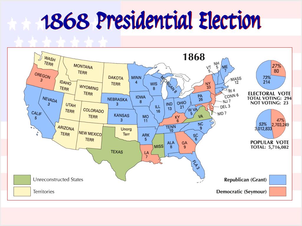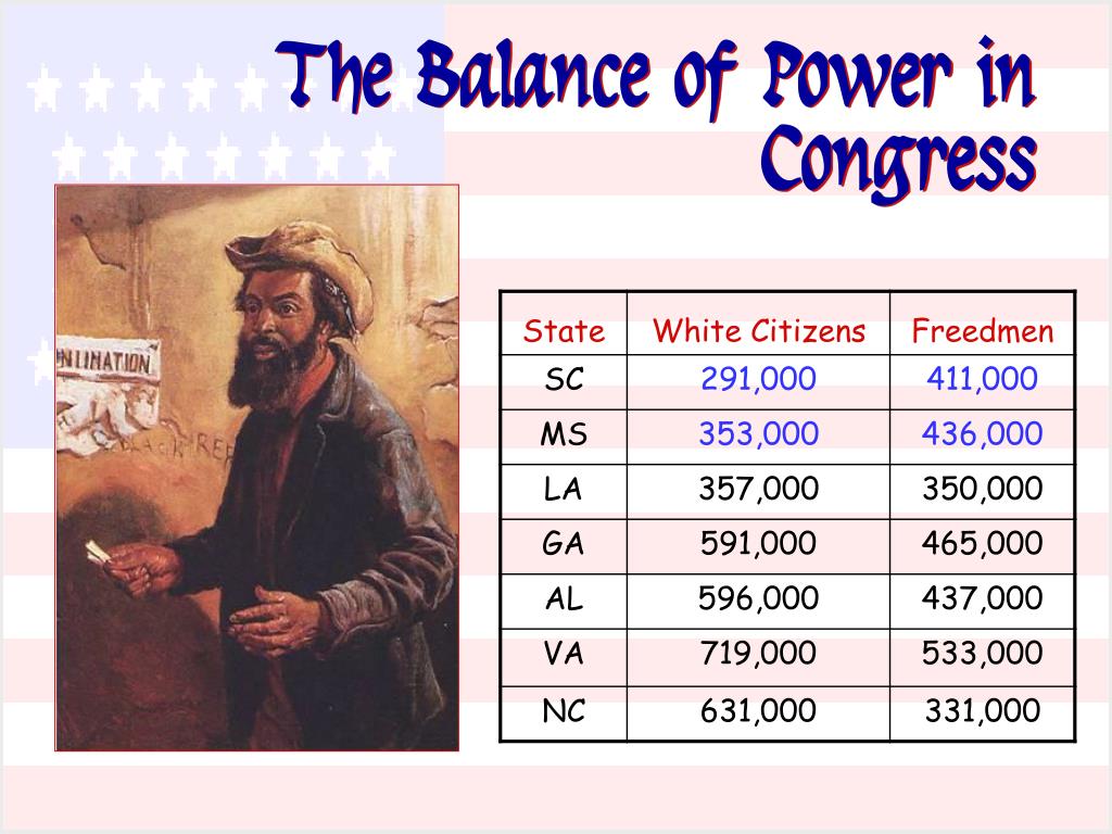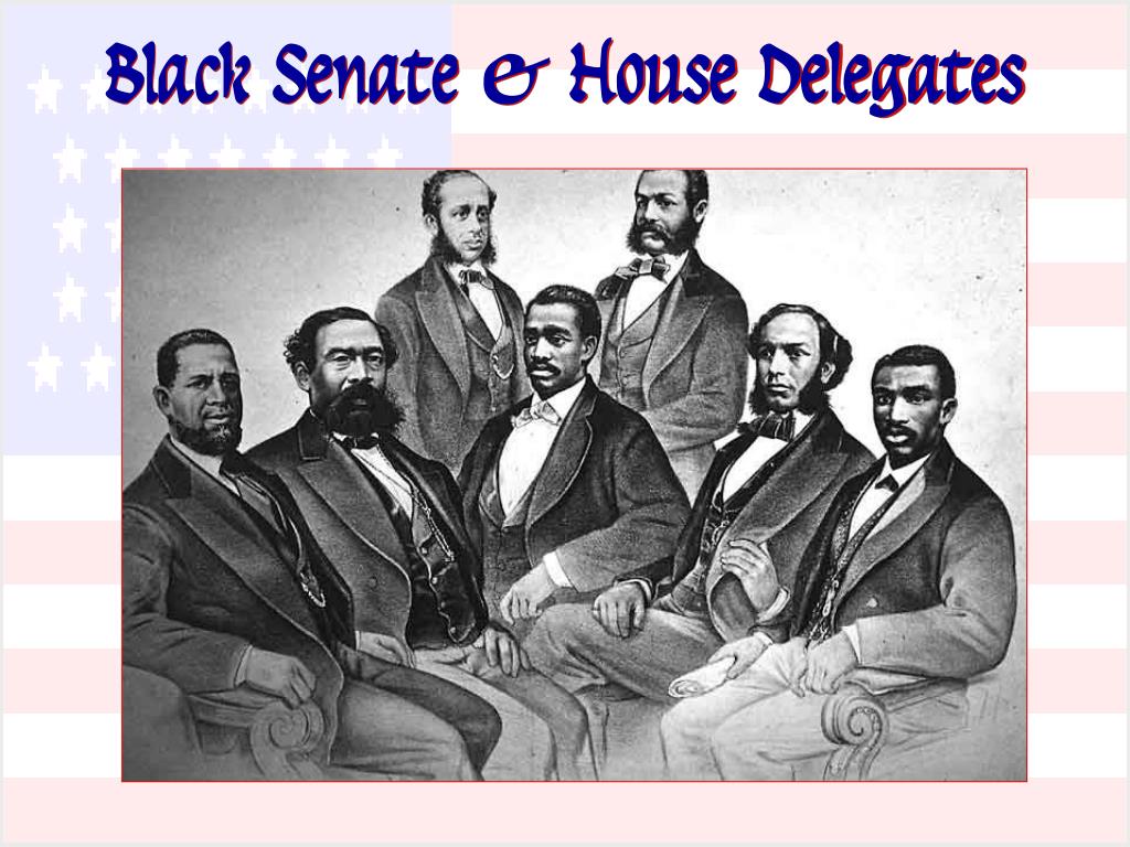 Radical Plan for Readmission • Civil authorities in the territories were subject to military supervision. • Required new state constitutions, includingblack suffrage and ratification of the 13th and 14th Amendments. • In March, 1867, Congress passed an act that authorized the military to enroll eligible black voters and begin the process of constitution making.