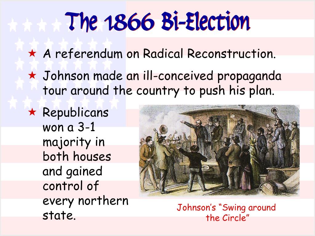 Johnson’s “Swing around the Circle” The 1866 Bi-Election • A referendum on Radical Reconstruction. • Johnson made an ill-conceived propaganda tour around the country to push his plan. • Republicanswon a 3-1majority in both houses and gained control of every northern state.