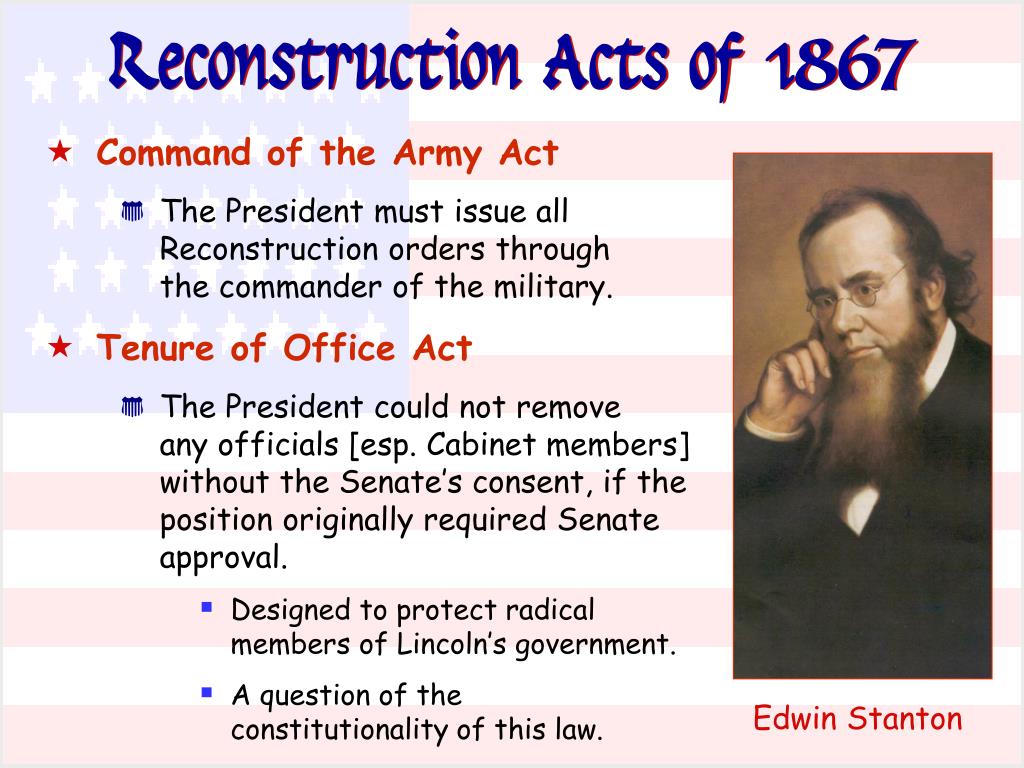 Reconstruction Acts of 1867 • Command of the Army Act • The President must issue all Reconstruction orders through the commander of the military. • Tenure of Office Act • The President could not remove any officials [esp. Cabinet members] without the Senate’s consent, if the position originally required Senate approval. • Designed to protect radicalmembers of Lincoln’s government. • A question of the constitutionality of this law. Edwin Stanton