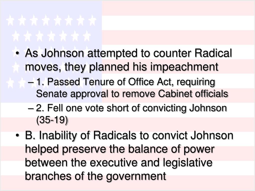 As Johnson attempted to counter Radical moves, they planned his impeachment • 1. Passed Tenure of Office Act, requiring Senate approval to remove Cabinet officials • 2. Fell one vote short of convicting Johnson (35-19) • B. Inability of Radicals to convict Johnson helped preserve the balance of power between the executive and legislative branches of the government