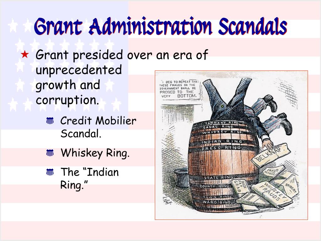 Grant Administration Scandals • Grant presided over an era of unprecedented growth and corruption. • Credit Mobilier Scandal. • Whiskey Ring. • The “Indian Ring.”